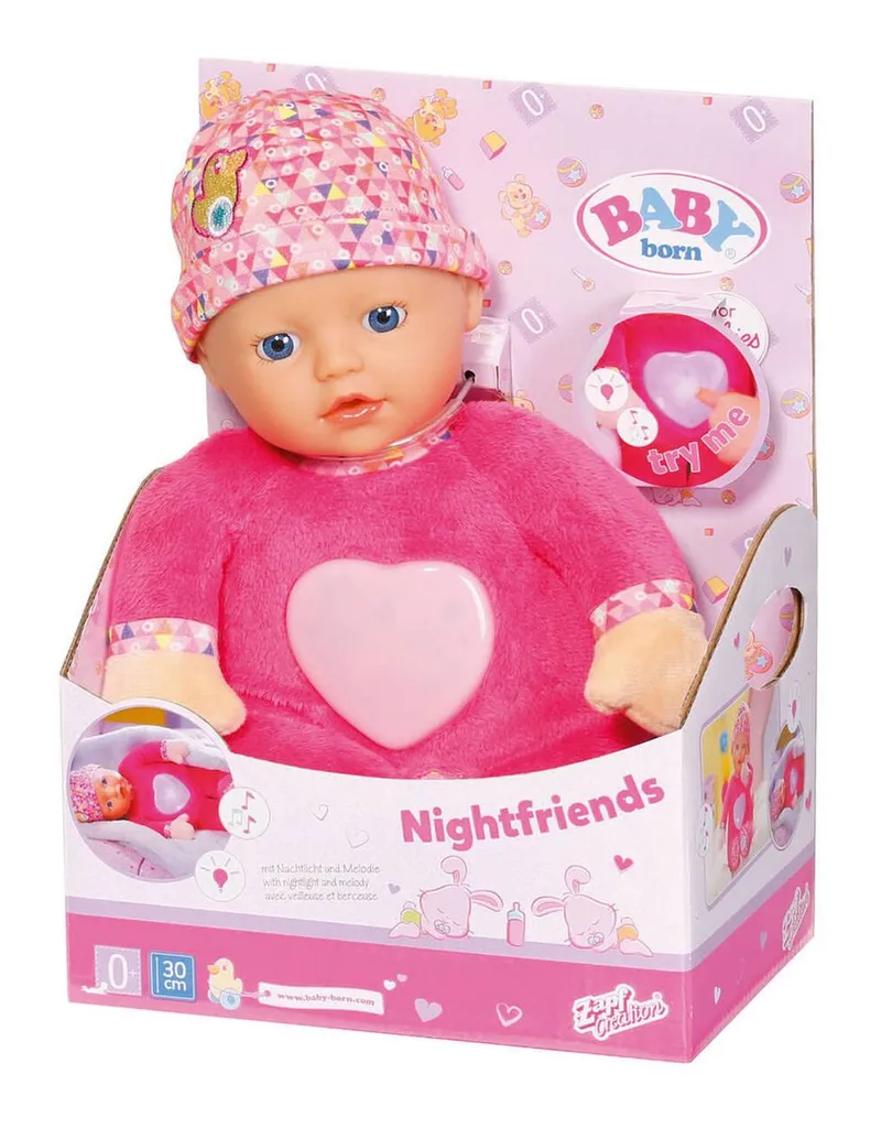 Good night friends! The lovable 30 cm doll is a great first friend for little ones and can even be placed in the cradle or cot for infants. She has a soft stuffed body and a super-cuddly pink romper. The hat with cute print protects BABY born’s head during extended cuddle sessions. Pressing the heart on her tummy activates a night light in cute duck form, and a soothing melody can be heard. This makes falling asleep child’s play.- BABY born branded doll- For playing, cuddling, to help the child sleep and as an introduction to parent-child role play- The doll’s body and limbs are made from fabric with soft and cuddly stuffing- Suitable for babies from birth- Batteries required (included)