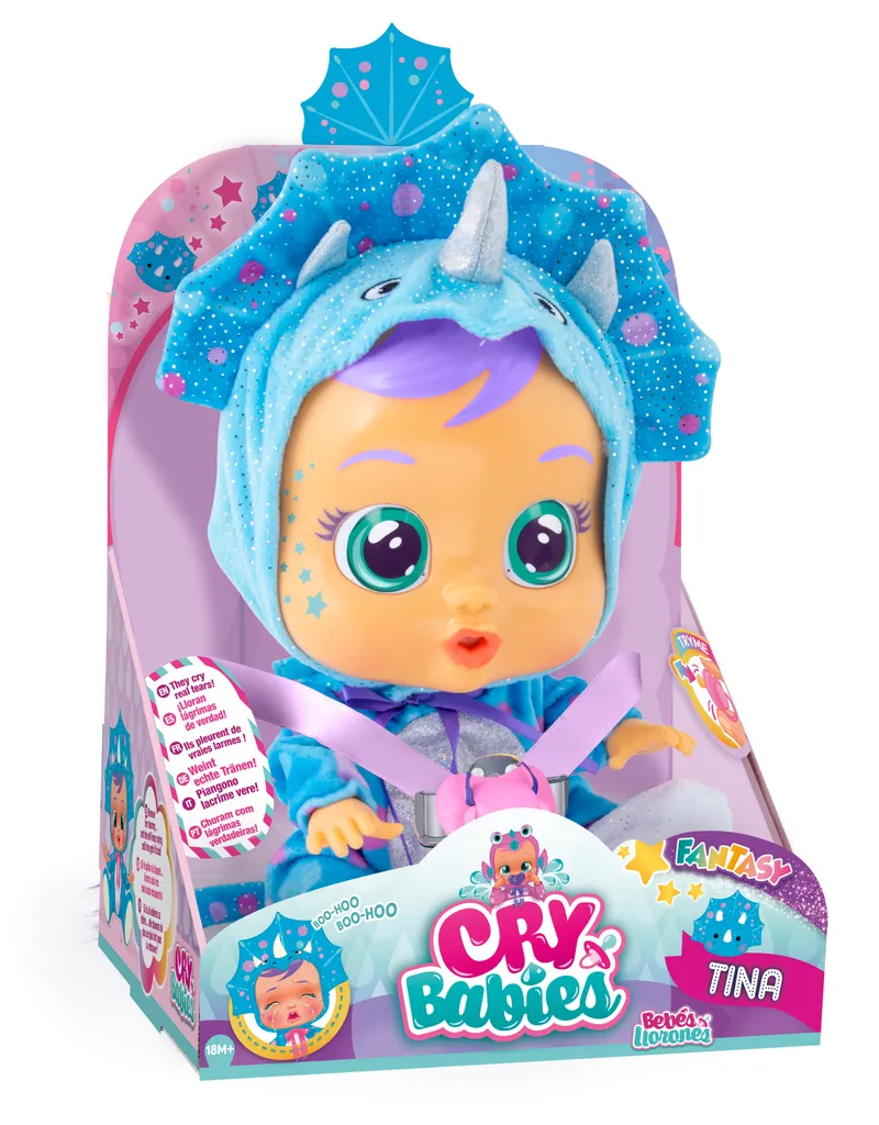 Süße Tränen trocknen schnell! Das niedliche Cry Baby Fantasy Tina braucht viel Liebe und Fürsorge und stets ihren Schnuller. Wenn dieser verloren geht, weint sie Kullertränen und beginnt zu jammern. Sie gibt außerdem schluchzende Laute von sich – fast wie ein echtes Baby. Einfach zum Liebhaben! Das Set enthält jeweils 1 Cry Baby, einen Schnuller und einen ausziehbaren Schlafanzug.