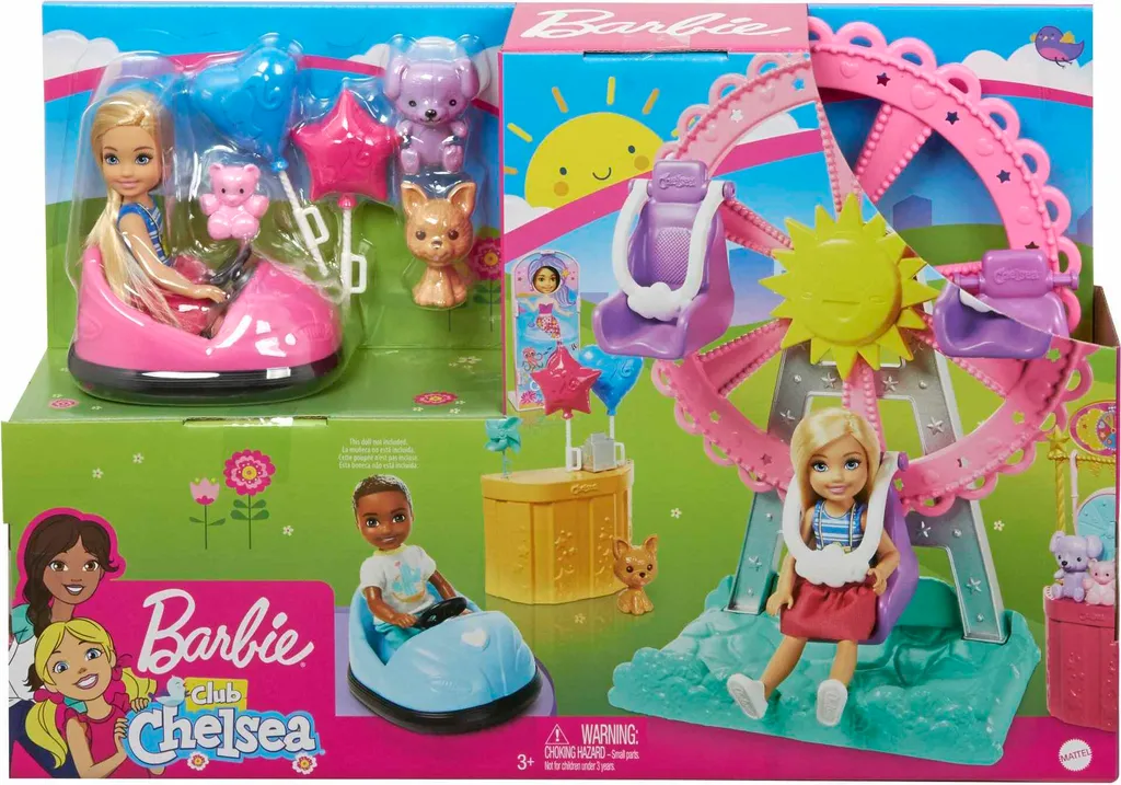 Chelsea und ihre Freunde wecken in Kindern den Entdeckergeist! Genau wie die große Schwester Barbie probieren Chelsea gerne Neues aus, stellt sich Herausforderungen, habt Spaß und hilft Kindern dabei, ihre Träume zu verwirklichen! Dieses Barbie Chelsea Jahrmarkt-Spielset bietet fünf Spielbereiche, große Zubehörteile mit verschiedenen Funktionen, ein süßes Hündchen und jede Menge Spielspaß. Das bunte Riesenrad hat niedliche Details und dreht sich wirklich! Die Chelsea-Puppe und zwei ihrer Freunde (separat erhältlich) in das Riesenrad setzen, anschnallen und anschubsen, schon kann die Fahrt losgehen. Die Autoscooter haben rollende Räder und Platz für jeweils eine Puppe (oder ein Hündchen). Einfach anschieben und schon rollen sie los. Hier gibt es jede Menge Spaß zu erleben! In ihrem gestreiften Oberteil mit lustigem Kamera-Aufdruck, dem abnehmbaren pinkfarbenen Rock und den weißen Schuhen ist die Chelsea-Puppe bereit für einen Tag voller Spaß! Die Sonnenbrille und der coole Mützenschirm runden ihren Look perfekt ab! Mit diesem Chelsea-Spielset können kleine Abenteurer von 3 bis 7 Jahren ihre Jahrmarktsträume wahr werden lassen. Es macht Spaß, der Fantasie freien Lauf zu lassen, denn mit Barbie ist alles möglich! Kinder können weitere Chelsea-Puppen sammeln und noch mehr Spielmöglichkeiten entdecken. Alle Artikel separat erhältlich. Die Puppe kann nicht von allein stehen. Abweichungen in Farbe und Gestaltung vorbehalten.