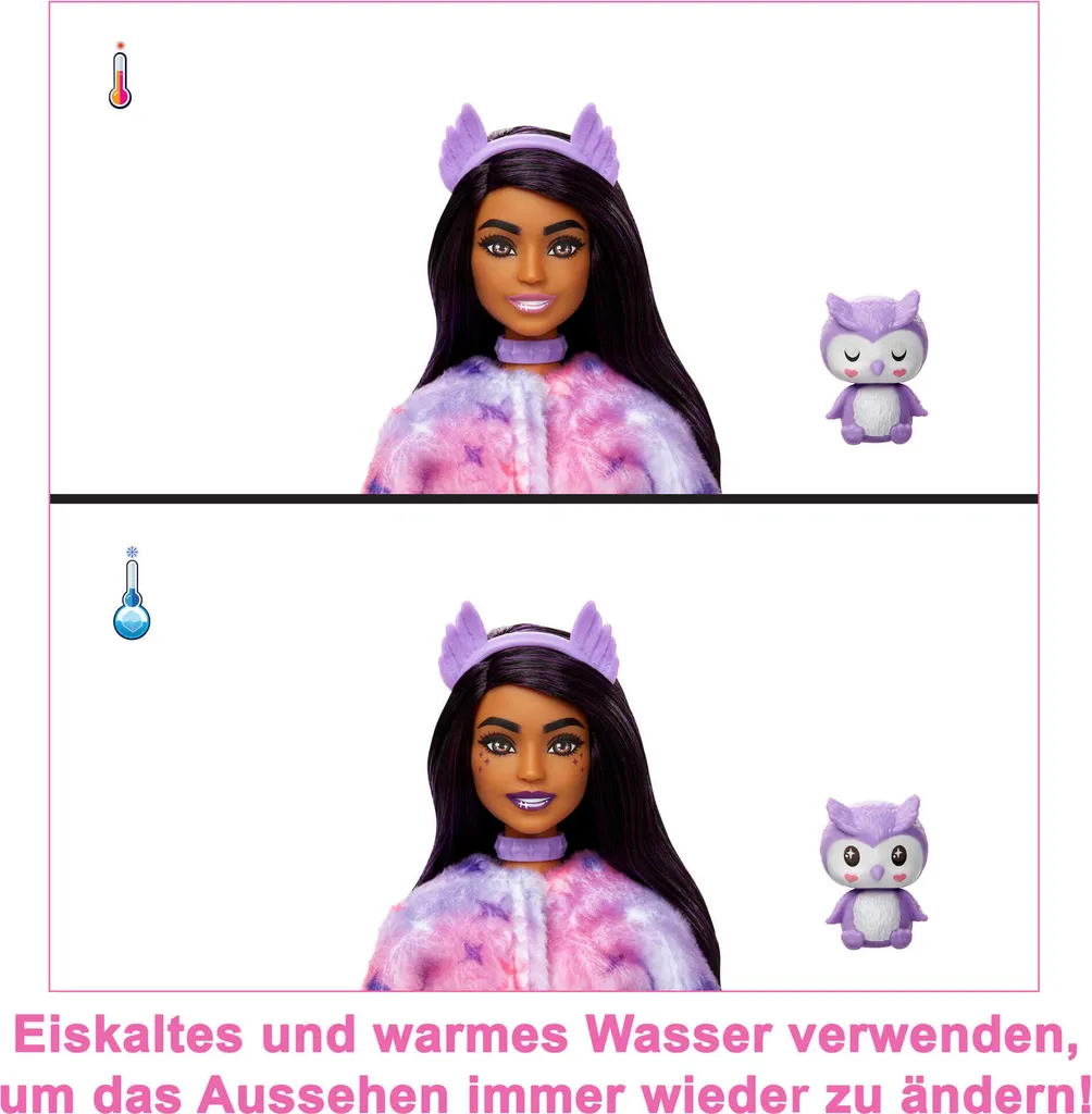 - Farbwechsel sorgen für weitere Überraschungen. Durch eiskaltes Wasser erscheint auf dem Gesicht der Barbie-Puppe eine winterliche Tierbemalung und die Augen der Mini-Eule können sich „öffnen und schließen“. Mit warmem Wasser verschwindet das Design wieder. Jedes Mal wieder ein toller Spaß!