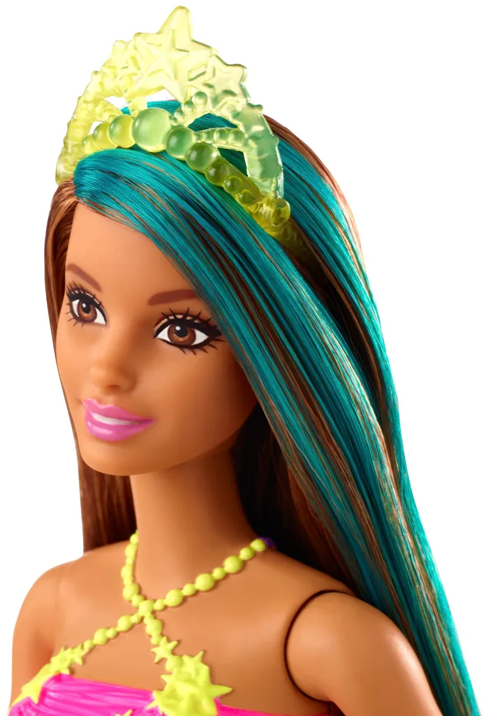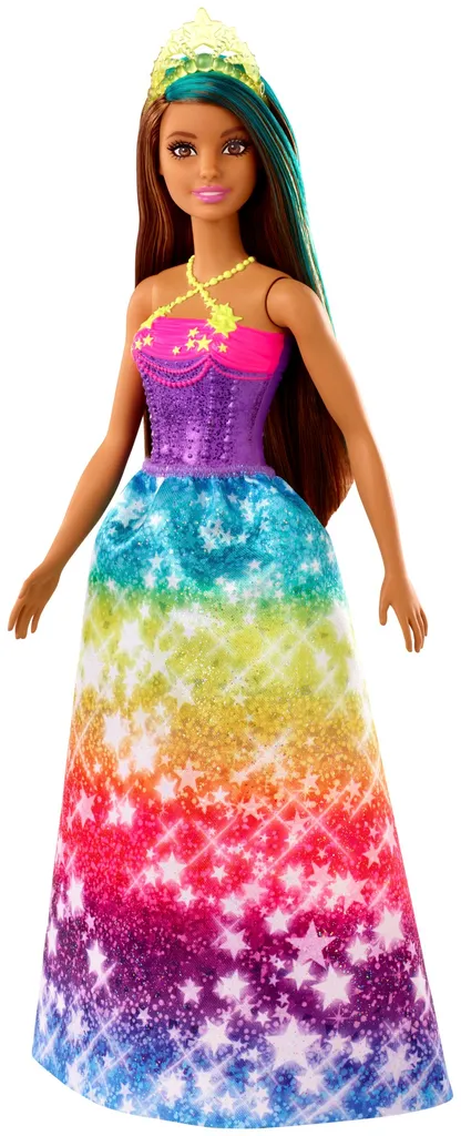 Mit den märchenhaften und farbenfrohen Outfits der Barbie Dreamtopia Prinzessinnen-Puppen werden alle Träume wahr! In ihrem glitzernden pink- und lilafarbenen Oberteil und dem auffälligen Rock mit Sternen- und Regenbogenmuster ist die Barbie Prinzessinnen-Puppe für jede königliche Veranstaltung angemessen gekleidet. Die türkis gesträhnte Haarpartie setzt einen weiteren Farbakzent und das leuchtende Diadem rundet den märchenhaften Look ab. Mit den Barbie Prinzessinnen-Puppen ist es ganz leicht, Träume auszuleben, denn Dreamtopia ist eine Welt, in der Träume wahr werden! Hier können Kinder jede Menge Spielspaß erleben. Mit allen Barbie Dreamtopia-Puppen und -Spielzeugen entsteht eine magische Welt, die zum Träumen und Spielen anregt! Alle Artikel separat erhältlich. Die Puppen können nicht von allein stehen. Abweichungen in Farbe und Gestaltung vorbehalten.