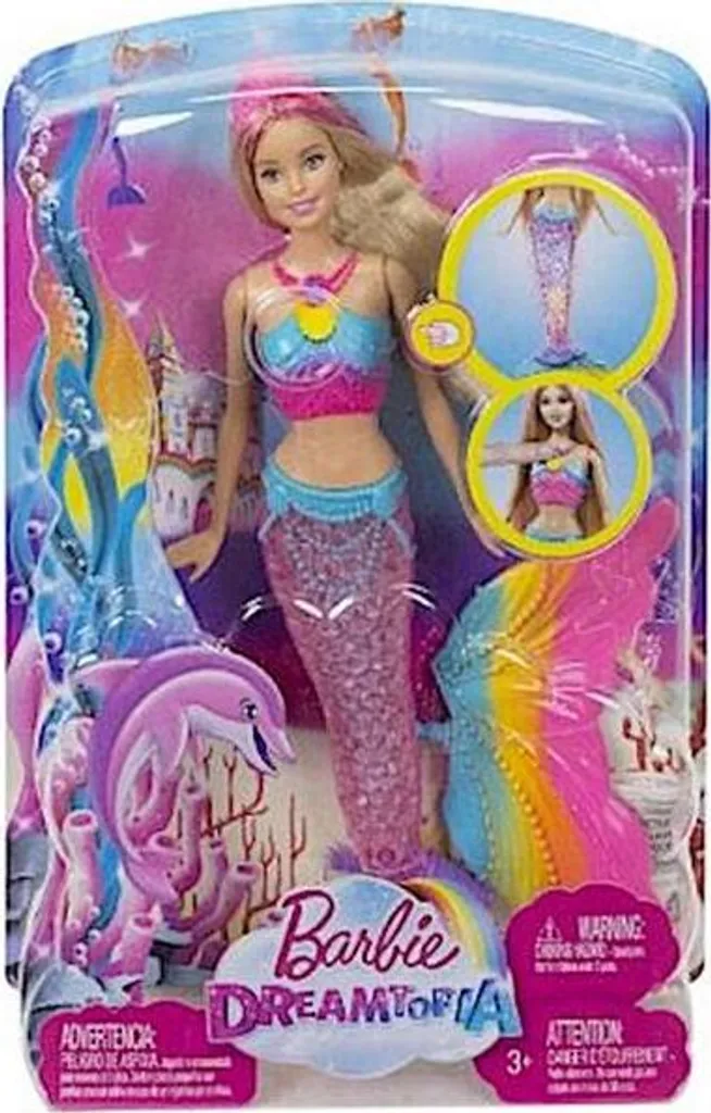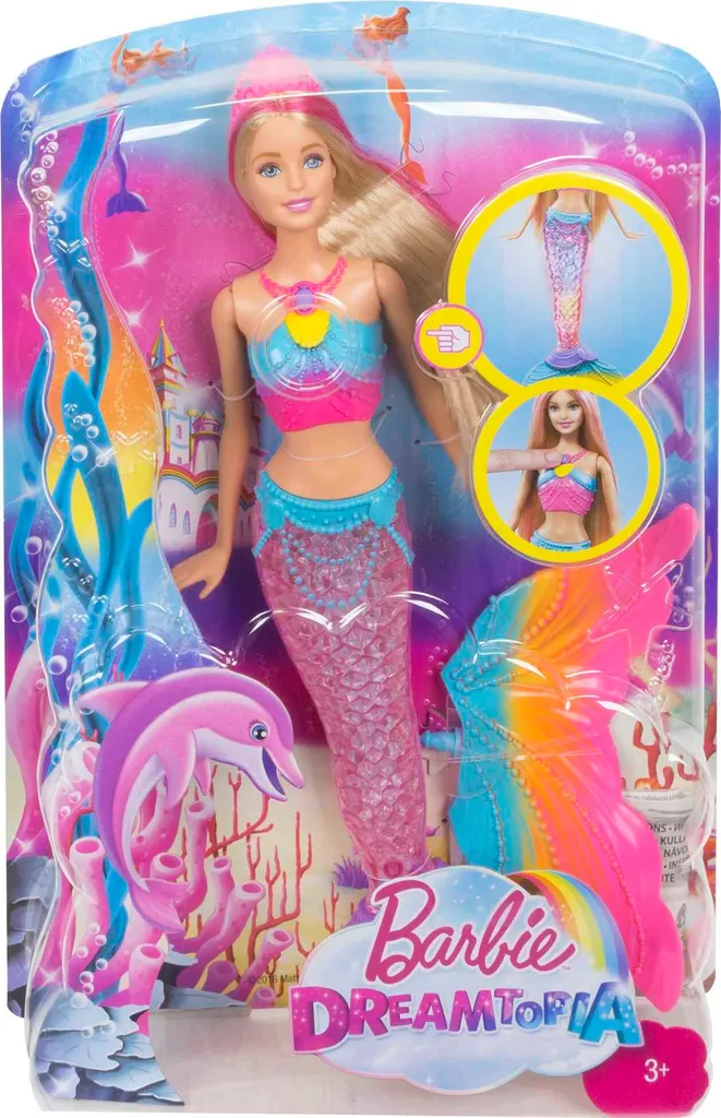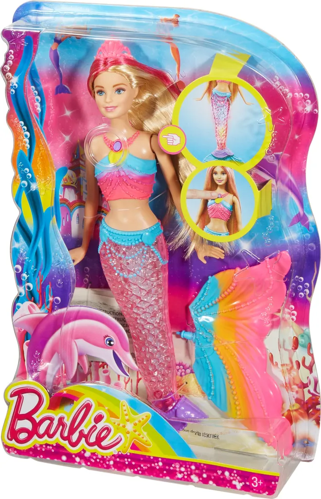 Erlebe aufregende Geschichten rund um die strahlende Meerjungfrau. Entdecke wie unglaublich das Meerjungfrauenunterteil in bunten Regenbogenfarben glitzert, wenn du den Knopf an Barbies Halskette betätigst. Nimm das märchenhafte Wesen mit in den Pool oder die Badewanne, so aktivierst du eine farbenfrohe Lichtshow, die ihresgleichen sucht!