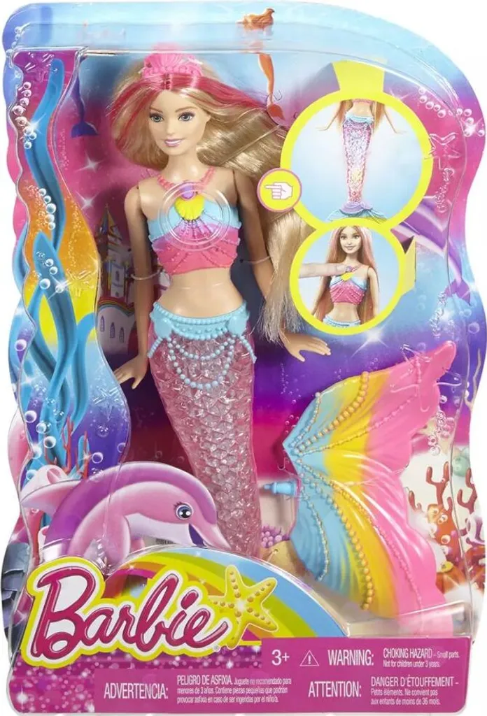 Make a real splash with this magical light-up Barbie mermaid doll!. Dip Barbie Rainbow Lights Mermaid doll into water to see her mermaid tail glimmer with colorful lights inspired by a sparkling rainbow!. Press the button in Barbie doll’s necklace to switch her to „on“ mode, and dip her into the tub or pool to activate the light showBarbie Rainbow Light Mermaid. Seguridad del producto: Este producto está sujeto a instrucciones y advertencias específicas de seguridad. Advertencia: No apto para niños menores de 36 meses. Advertencia: Sólo para uso doméstico. Advertencia: Utilícese bajo la vigilancia directa de un adulto. Por favor lea las recomendaciones del fabricante.