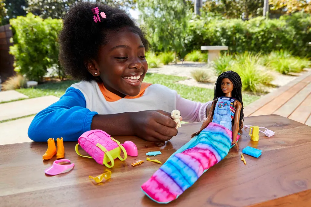 Auf die „Malibu“ und „Brooklyn“ Barbie-Puppen wartet das größte Abenteuer – mit Barbie-Puppen, die von It Takes Two inspiriert sind! Kinder können die „Brooklyn“ Barbie-Puppe mit ihrem Hündchen und mehr als 10 Camping-Zubehörteilen auf ihrem ultimativen Campingausflug begleiten und sich zu Geschichtenspaß aller Art inspirieren lassen. Bereit für die Erkundungsmission? Einfach den Schafsack der Barbie-Puppe befestigen und den Rucksack mit Wanderutensilien wie einer Taschenlampe, einem Notizbuch und einem Stift, einer Wasserflasche und weiteren Accessoires packen. Nach einem Tag voller Abenteuer können Kinder die „Brooklyn“ Barbie-Puppe und ihr Hündchen in den gemütlichen Schlafsack legen, wo sie unter dem Sternenhimmel träumen können. Mit so vielen Teilen zum Geschichtenerzählen rund um Camping können Kinder von 3 bis 7 Jahren ihre Barbie-Puppe mit auf endlose Outdoor-Abenteuer nehmen. Die Puppe kann nicht von allein stehen. Abweichungen in Farbe und Gestaltung vorbehalten.