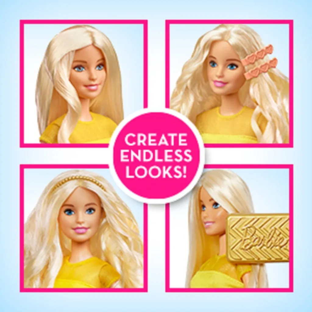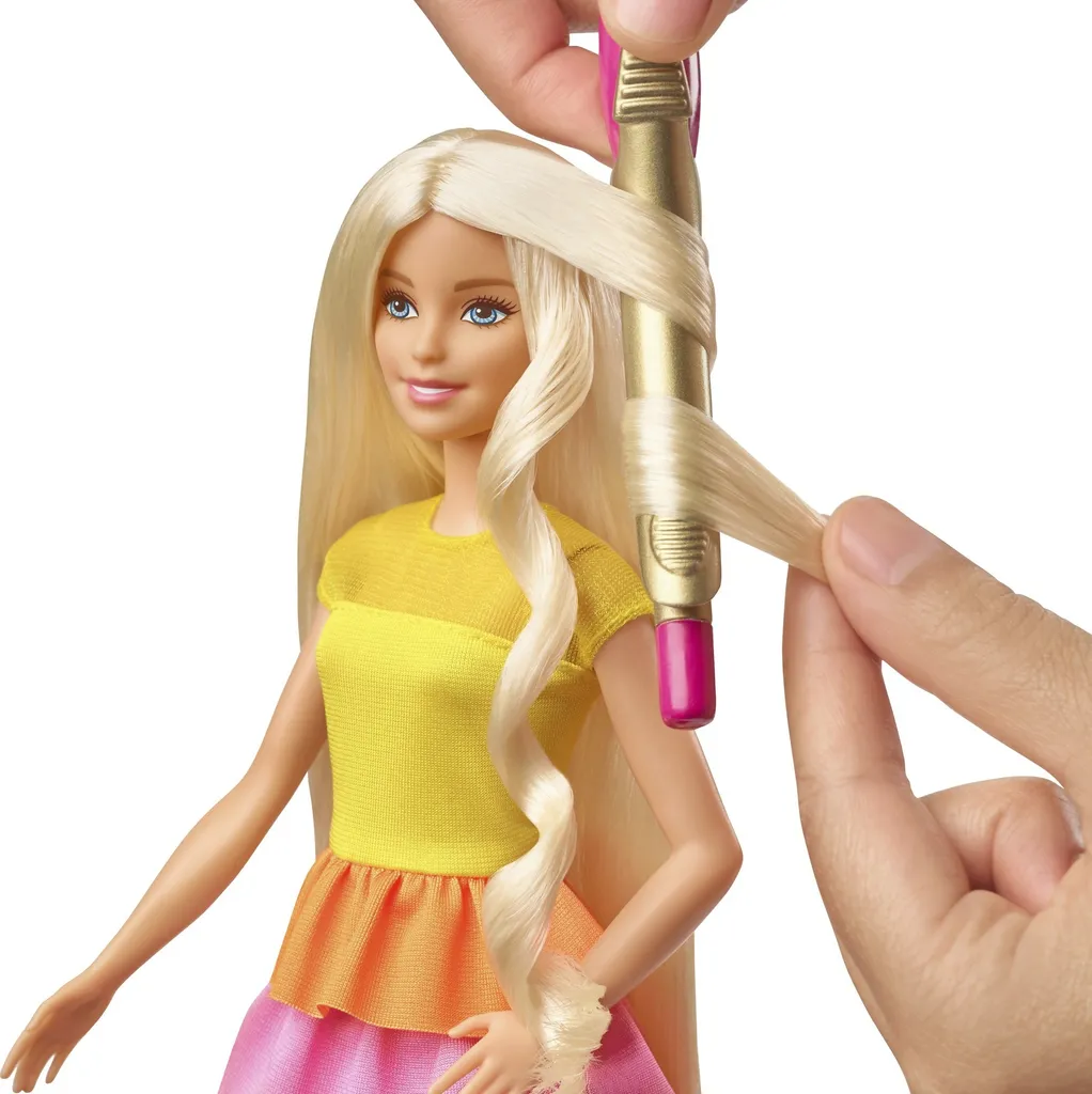 Diese Schachtel mit einer Puppe und neun Friseurzubehörteilen erleichtert das Erstellen von Locken und Drehungen, um benutzerdefinierte Stile in Barbie zu erstellen.