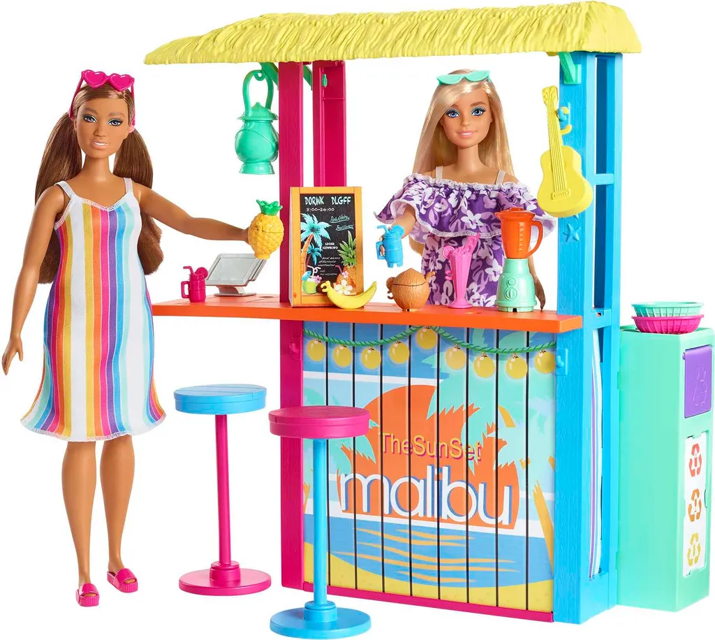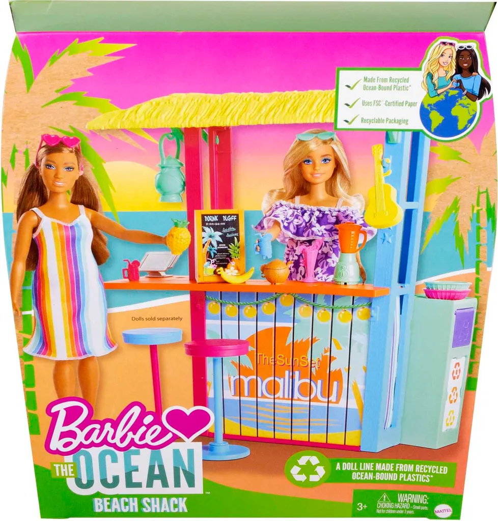 Mit diesem Barbie Loves the Ocean Strandhüttenspaß Spielset aus recyceltem Kunststoff können Kinder den perfekten Sommertag am Strand erleben. Mit über 18 Zubehörteilen, darunter tropische Getränke, Eiswaffeln, ein Mixer und Snacks, ist die Barbie Strandhütte der perfekte Ort für eine Abkühlung und leckere Erfrischungen an heißen Tagen! Es gibt so viele Möglichkeiten, um der Fantasie freien Lauf zu lassen – die Barbie Puppe (separat erhältlich) bedient Kunden am Fenster oder macht es sich auf einem Hocker gemütlich und nimmt die Rolle der Kundin ein. Die niedlichen Zubehörteile zum Geschichtenerzählen umfassen eine Ukulele, Recycling-Station, Speisekarte und mehr aus recyceltem Kunststoff. Puppen separat erhältlich. Der recycelte Kunststoff ist flexibel. Lässt sich nach Bedarf formen und anpassen. Abweichungen in Farbe und Gestaltung vorbehalten.