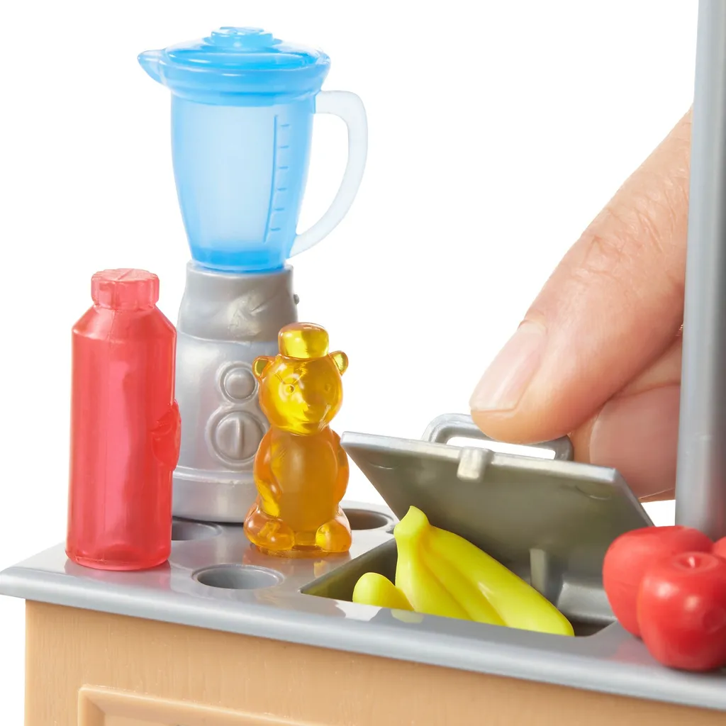 Enthält eine Barbie-Puppe (29,21 cm) mit Moden und Accessoires, einen Marktstand mit Waage, einen Wagen mit rollenden Rädern und einem Schirm, eine Waage, eine Kasse, zwei Kisten, eine Einkaufstasche, einen Mixer und Accessoires zum Thema Lebensmittel.
