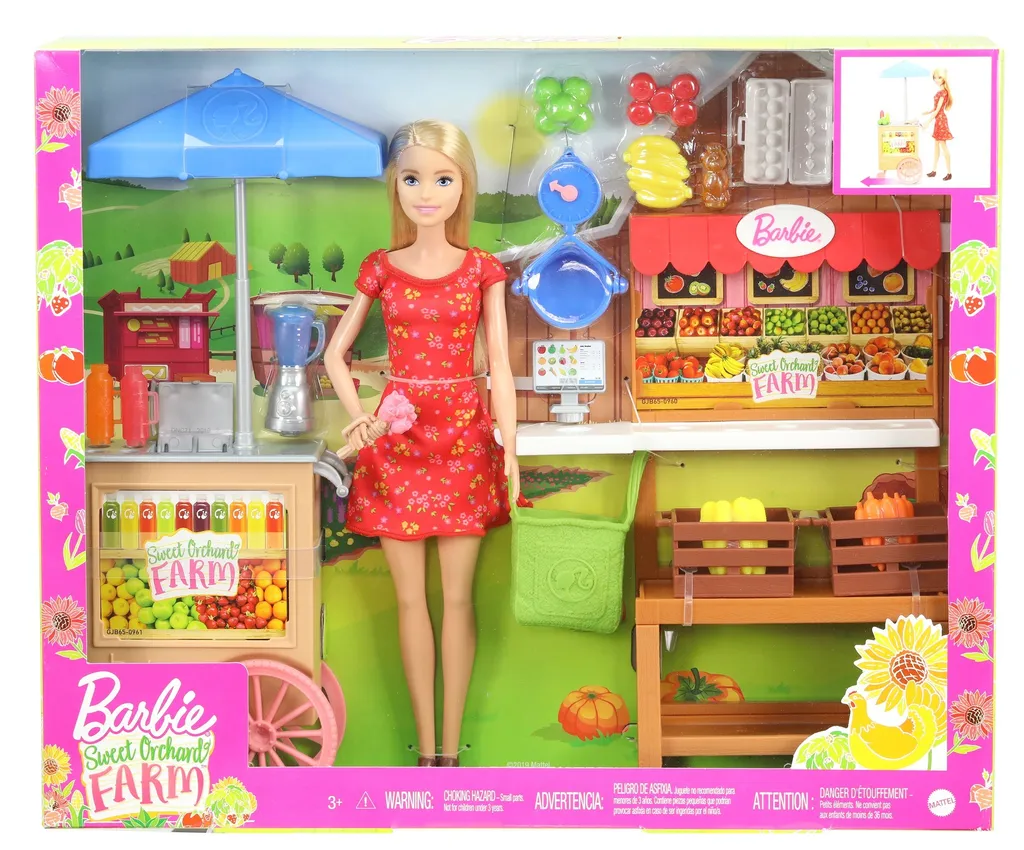 Der Barbie „Spaß auf dem Bauernhof“ Bauernmarkt ist mit einem Marktstand und einem Snackwagen für Kundschaft geöffnet.