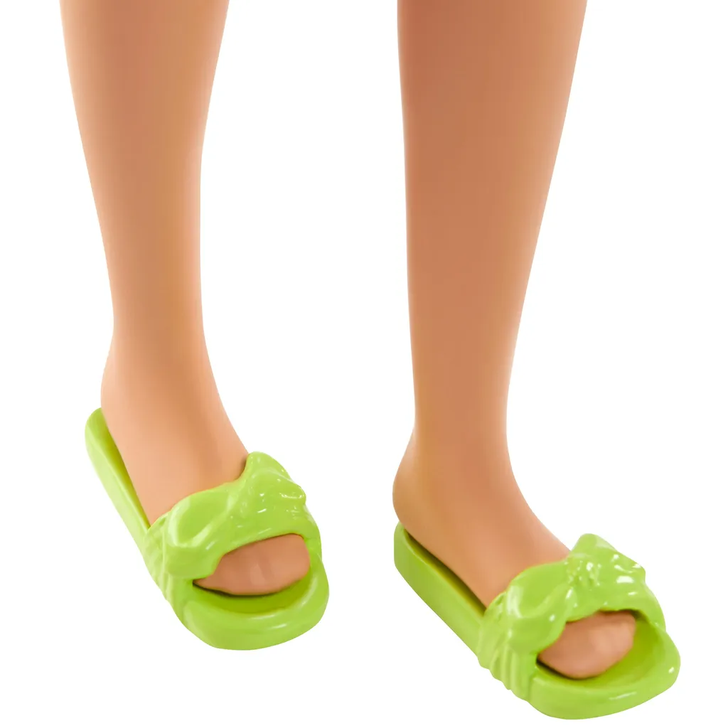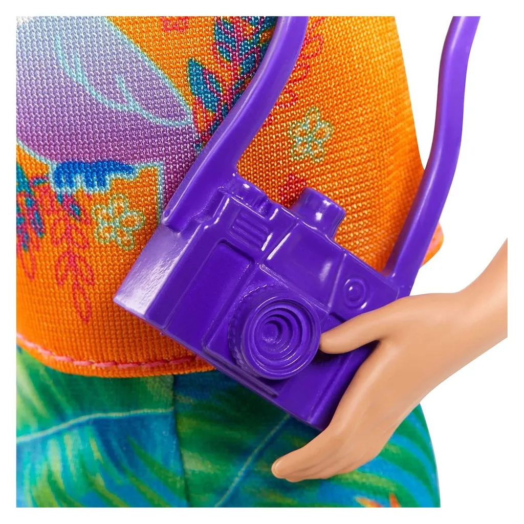 Die Skipper-Puppe trägt ein Reiseoberteil, Shorts mit tropischem Muster und orangefarbene Sandalen.