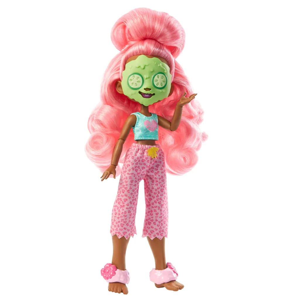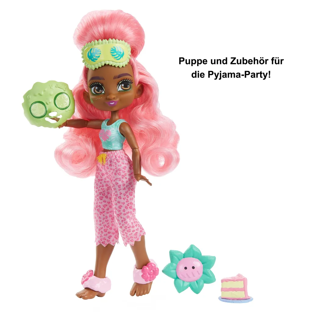 Fernessa trug einen Stoffpyjama, eine rosa Hose und ein türkisfarbenes Oberteil. Die Puppe misst 20 cm, sie trägt sehr lange Haare und ihr Körper ist in 11 Punkten gegliedert. Zubehör (Kuchenstück, Blume, Maske) zum Thema ist in der Puppe enthalten