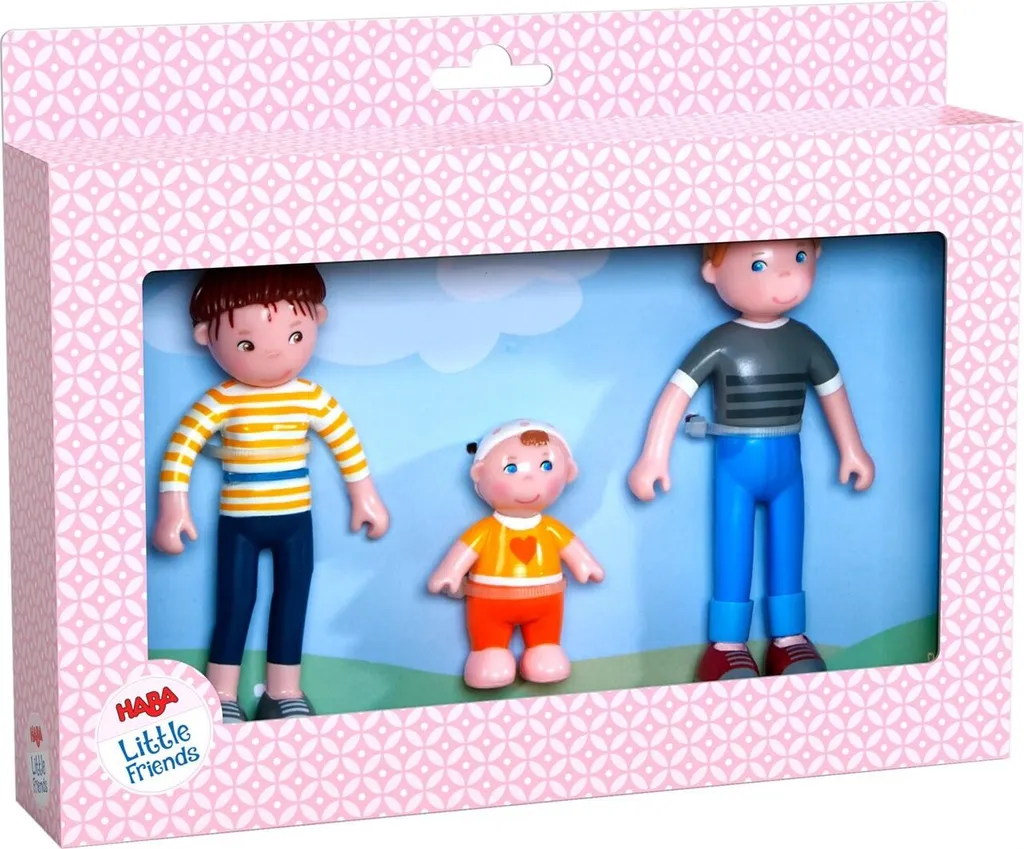 Ein glückliches Trio enthält das Little Friends-Spielset Familie für Kinder ab 3 Jahren. Mama Kristin, Papa Mirko und Baby Stella erweitern die Welt der beliebten HABA Puppenhaus-Serie. Die liebevoll gestalteten Minipuppen laden Kinder zu kreativen Rollenspielen rund um den eigenen Alltag ein. Die Kleinen kreieren mit vielen verschiedenen Figuren, süßen Tieren und tollem Zubehör ihre eignen Spielwelten. Solche Rollenspiele fördern die sozialen Fähigkeiten sowie die emotionale Entwicklung und regen die Fantasie an. Spielend Abenteuer erleben mit den Little Friends von HABA.