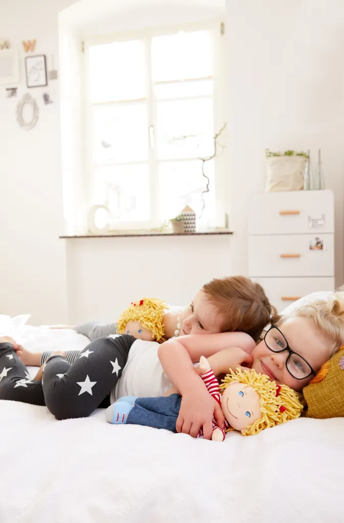 Jetzt können Kinder ihre Lieblingsfigur als Puppe knuddeln, sie überall hin mitnehmen und mit ihr Geschichten erfinden und nachspielen … zu Hause, im Kindergarten oder auf Reisen. Selbstverständlich hat sie einen rot-weiß geringelten Pulli an und eine rote Schleife im Haar aus weichen Chenille-Fäden. Ringelpulli und Jeans können ausgezogen werden, sodass Conni auch leicht mal in andere Klamotten schlüpfen kann.