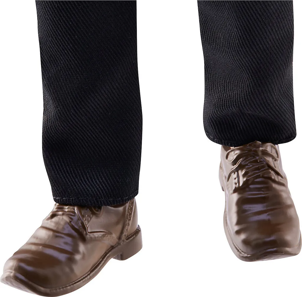 Die Sirius Black Puppe hat markante braune, gelockte Haare (die Haare sind aus Plastik) und ist in einem unverwechselbaren Outfit gekleidet – mit einem gestreiften Hemd, einer bedruckten Weste, einem olivfarbenen Mantel und einer schwarzen Hose. Sie hat braune Stiefel an den Füßen und hält ihren Zauberstab in der Hand.