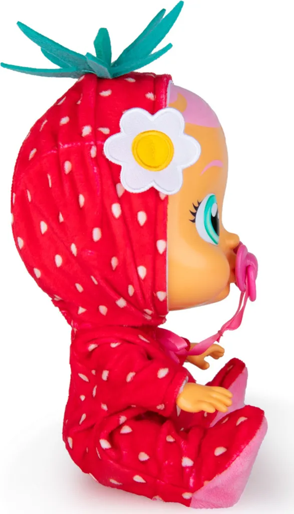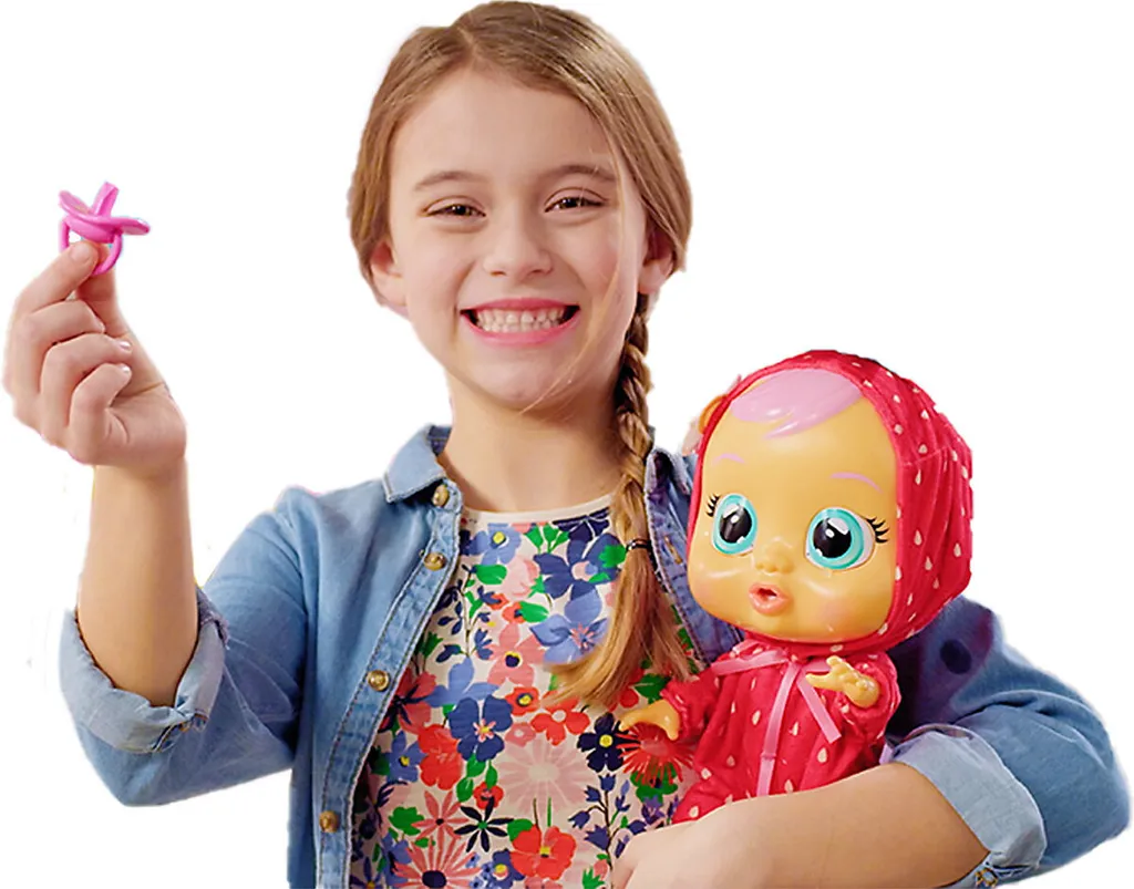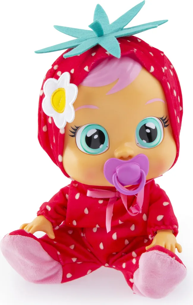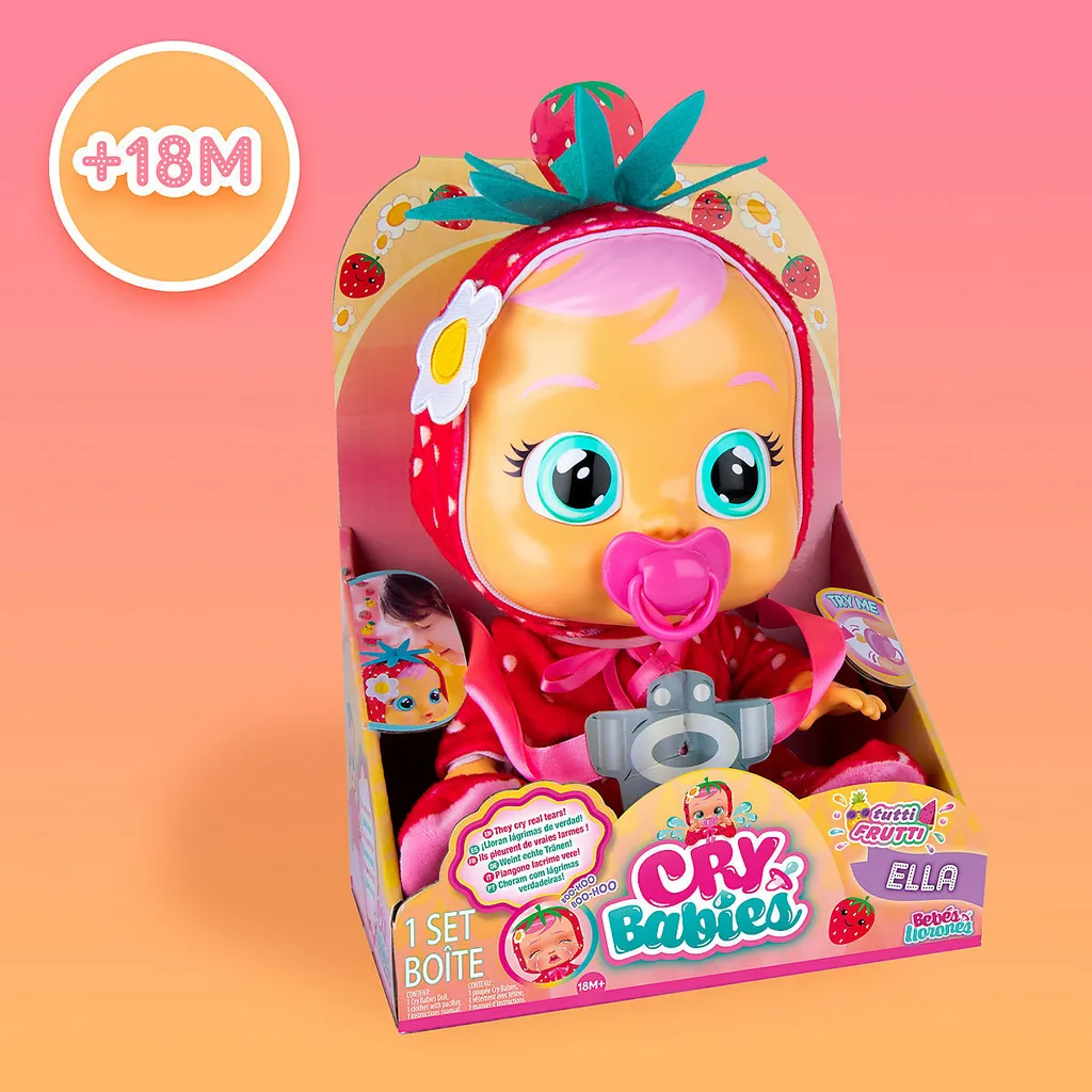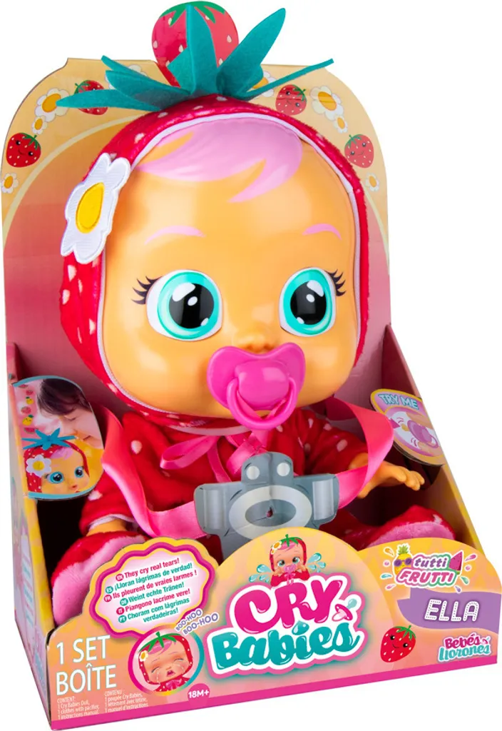 Süße Tränen trocknen schnell! Das niedliche Cry Baby Tutti Frutti Ella braucht viel Liebe und Fürsorge und stets ihren Schnuller. Wenn dieser verloren geht, weint sie Kullertränen und beginnt zu jammern. Sie gibt außerdem schluchzende Laute von sich – fast wie ein echtes Baby. Einfach zum Liebhaben! Das Set enthält jeweils 1 Cry Baby, einen Schnuller und einen ausziehbaren Schlafanzug.