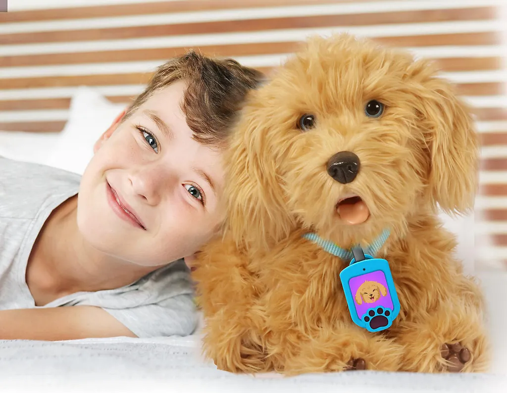 Wer kommt denn da? Das ist Moji, der große interaktive Labradoodle-Welpe von Joy Toy. Für alle kleinen Hunde-Fans, die sich sehnlichst ein eigenes Haustier wünschen ist Moji ein toller Übungskumpel! Der bezaubernde Labradoodle reagiert auf Sprache, Berührung und begeistert mit über 150 Reaktionen. Er kann „Sitz“ und liebt es am Seil zu ziehen und zu spielen. Außerdem trägt Moji ein interaktives Halsband, mit dem der kleine Hundewelpe kommunizieren kann, wie es ihm geht. Moji hat alles dabei für einen tollen Start in seinem neuen Zuhause: ein Futternapf, ein kleines Spielzeug und auch eine Bürste für sein superflauschiges Fell. Und dann heißt es natürlich Üben, denn Moji kann Tricks lernen und noch viel mehr. Der kleine Welpe reagiert auf die deutsche und die französische Sprache und wird ganz schnell zum neuen Lieblingsbegleiter der kleinen Tier-Freund*innen.Details:- Moji, der große interaktive Labradoodle-Welpe von Joy Toy- bezaubernder und beweglicher Hundewelpe-Kuschelkumpel- mit Sound-Effekten- reagiert auf 10 Sprachbefehle, kann „Sitz“ und mit dem Schwanz wedeln – interaktives Halsband für Kommunikation (über benutzerdefinierte Emojis)- der Moji hat 2 Sprach-Modes: deutsch und französischMaße: ca. 35 cmMaterial: PolyesterHinweise:Für den Betrieb werden 4 x Batterie (LR14) benötigt. Diese sind nicht im Lieferumfang enthalten. html
