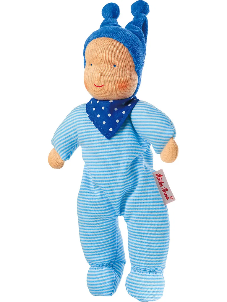 Baby Schatzi blau ist mit ihren 28 cm die ideale Puppe für kleine Kinderhände. Weich gefüllt mit Polyesterwatte zum schmusen und kuscheln. Mit Ihrem gestreiften Körper aus Baumwolljersey, der Zipfelmütze aus blauem Nicki und dem gepunktetem Halstuch ist die Puppe für Kinder ab 0 Monaten geeignet.