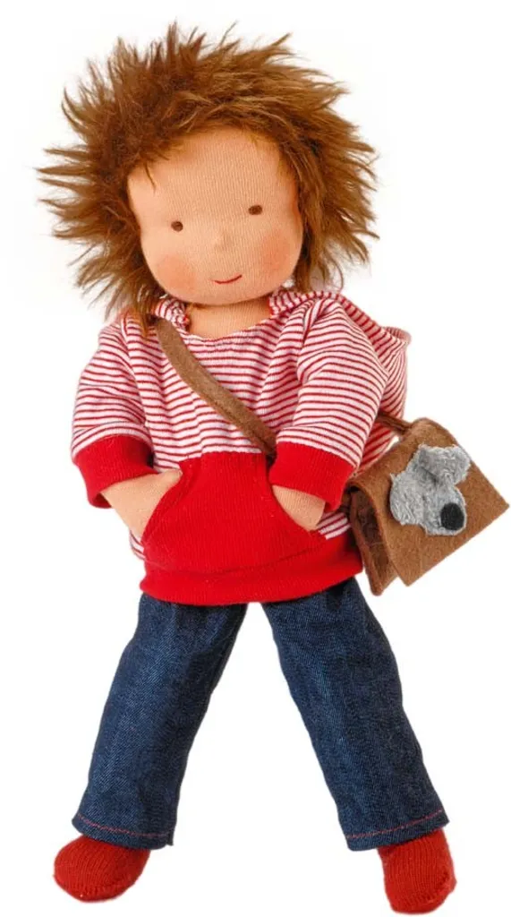 Die Waldorfpuppen von Käthe Kruse sind handgemachte, ganz weiche Stoffpuppen. Ganz im Sinne der Waldorf-Philosophie sind die Gesichter schlicht und einfach gehalten. So sollen sie verstärkt die Fantasie anregen und zum kreativen Spielen einladen. Der weiche Stoffkörper ist mit natürlicher Schafwolle gefüllt. Der 38 cm große Benni mit seiner frechen Frisur und der schicken Umhängetasche, ist ein anschmiegsamer Waldorfjunge und freut sich schon darauf, in liebevolle Kinderhände genommen zu werden.Puppendetails im Überblick:- Körper: Weichkörper mit Füllung aus Schafwolle- Obermaterial: Baumwolle- Haare: Mohairplüsch- Handwäsche- Größe: 38 cm- Lieferumfang: Waldorf-Puppe inkl. Bekleidung (Kapuzenpullover, Jeans, Schuhe, Umhängetasche)