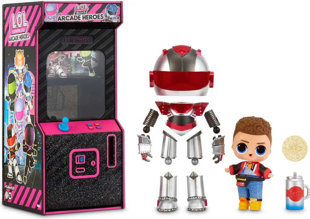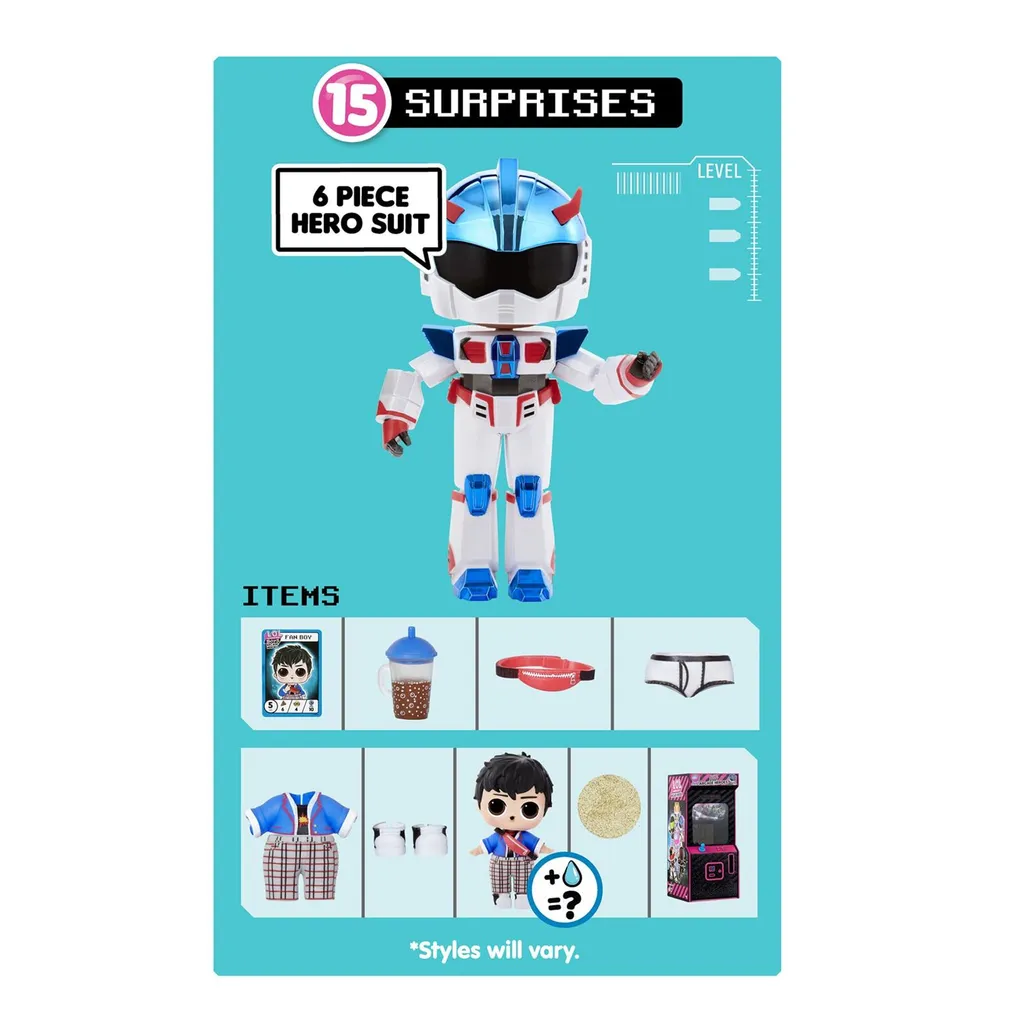 – Unbox 15 surprises including a action figure hero suit with L.O.L. Surprise! Boys Arcade Heroes.