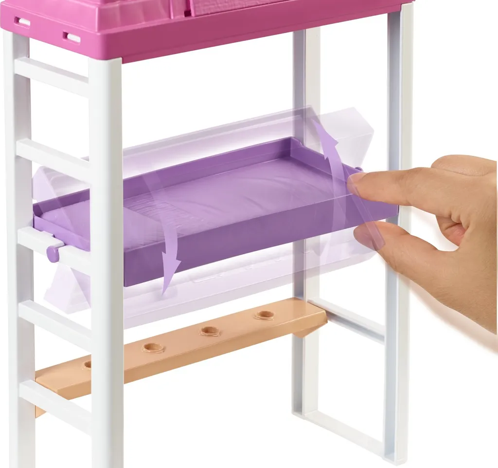 Estas literas añaden un toque moderno gracias a las funciones modificables que las niñas usarán una y otra vez mientras juegan a un día normal en la vida de Barbie.