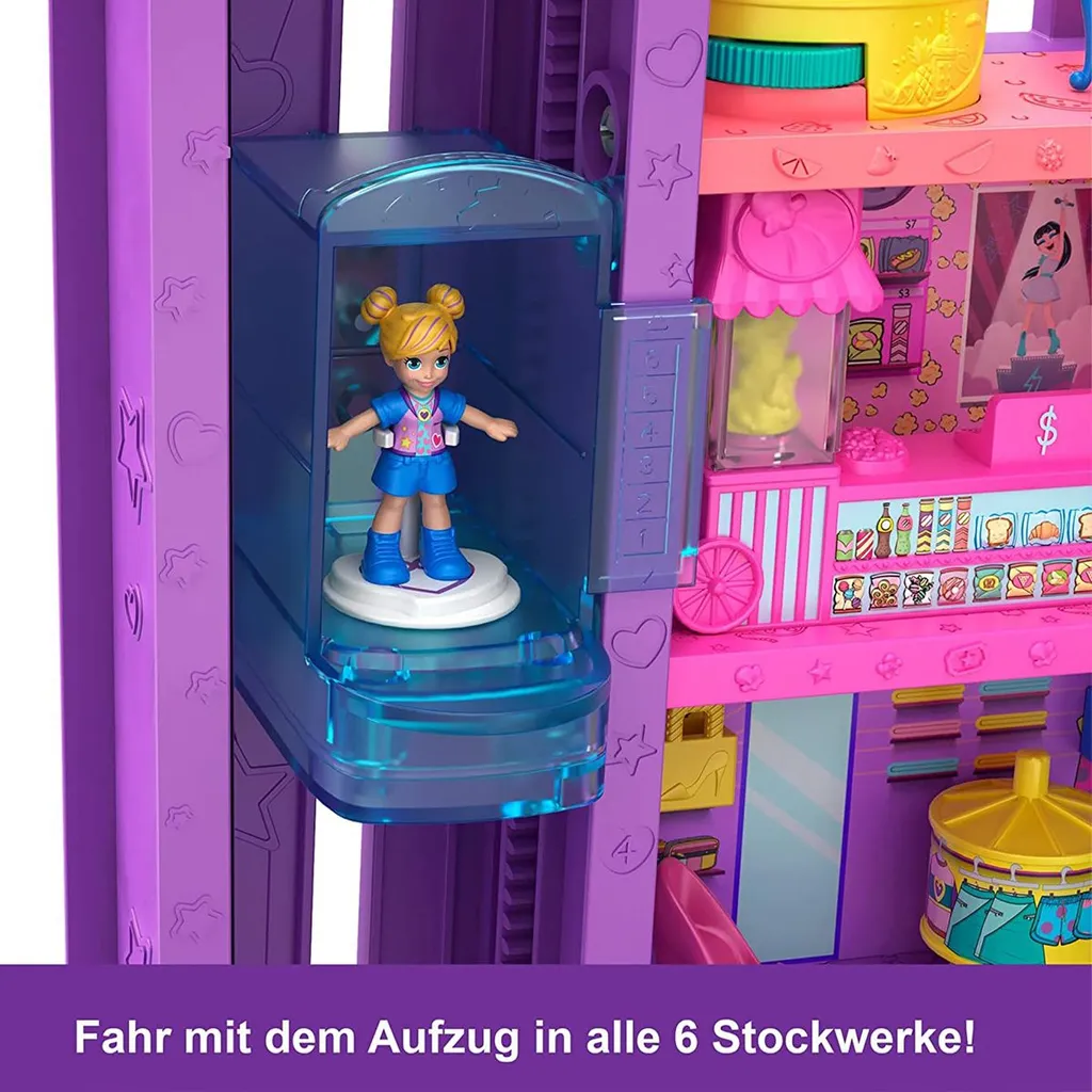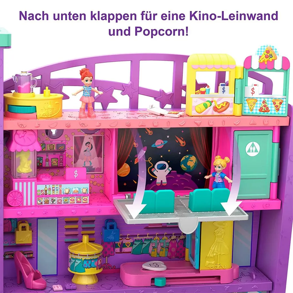 Polly und Lila können durch die Drehtür die Lobby mit dem rotierenden Springbrunnen betreten, im Food Court essen, die Klamotten in der Boutique begutachten und über den Laufsteg schweben, auf der Skate-Rampe skaten, im Sportzentrum ein Tor schießen oder einen Korb werfen, die Zoohandlung mit Aquarium und einem Welpenbereich für Peaches besuchen, im Elektronikgeschäft abhängen und zum Schluss im Kino einen Film anschauen und Popcorn essen (das Kino ist ausfaltbar und die Popcorn Maschine dreht sich).