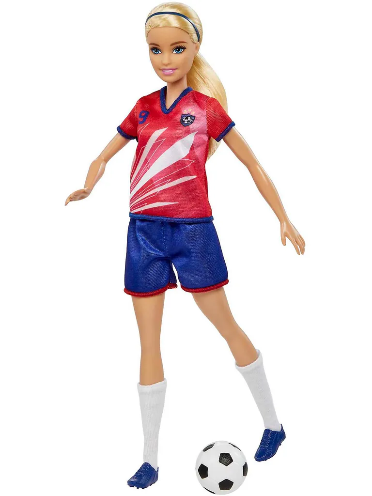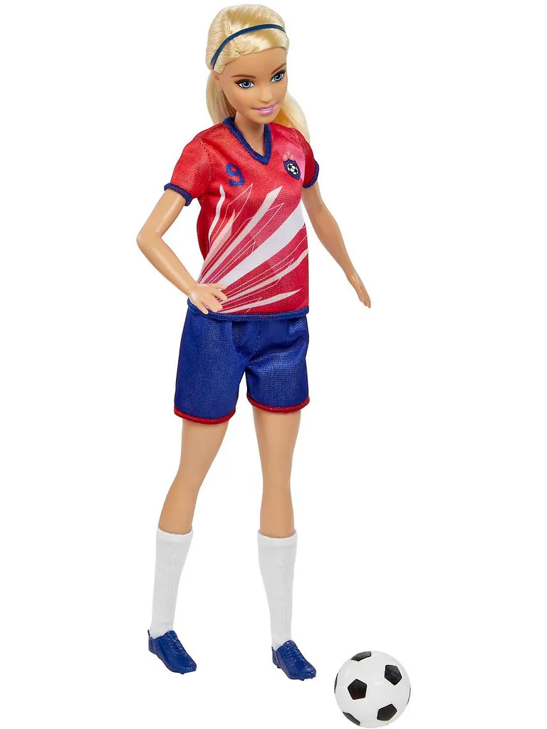Sportlich unterwegs mit Torjägerin Barbie. Auf dem Fußballplatz macht dieser Sportskanone so schnell keiner was nach. Durch jahrelanges Training ist sie blitzschnell, agil und koordiniert und dribbelt die Bälle an ihren Gegner*innen vorbei wie keine zweite. Unterstützt wird sie dabei von einer professionellen Ausstattung bestehende Aus Stollenschuhen, einem zweiteiligen Trikot, Stulpen und natürlichem das wichtigste: Der Fußball. Details:-Barbie Spielset von Mattel- Fußballspielerin-Puppe mit professioneller Ausstattung- Trikot mit Nr. 9 und Shorts- Stollenschuhe und Stulpen- inkl. BallMaße: – Höhe: ca. 29 cmMaterial: Kunststoff, Textil
