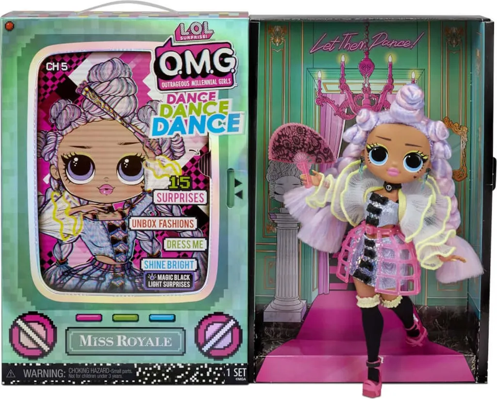 La bambola Miss Royale LOL Surprise Dance Dance Dance OMG include 15 sorprese da scoprire, inclusa una black light per rivelare ulteriori sorprese luminose. Miss Royale ha capelli acconciati e fa tantissime pose; è la sorella maggiore di Royal High-ney!, la preferita dei fan di LOL Surprise; scopri i passi di ballo di MIss Royale e diventa la regina della pista da ballo. Vesti Miss Royale con i suoi abiti e accessori e fai in modo che mostri i suoi passi di ballo con la confezione TV; rimuovi il coperchio e tira la linguetta: l’immagine della tua bambola si muove come se stesse ballando in TV. La confezione di Miss Royale diventa un playset riutilizzabile con schermo e pista da ballo. Miss Royale LOL Surprise Dance Dance Dance OMG ha abbigliamento firmato, scarpe, accessori moda, cappelliera, black light, spazzola per capelli, borsa porta abiti, adesivi, appendiabiti, supporto per bambola e playset riutilizzabile. Colleziona tutte e 4 le bambole LOL Surprise Dance Dance Dance OMG e crea la più grande dance-off che l’universo abbia mai visto. Funziona a batterie 3x 1,5V. Dimensioni: 20,5 x 31 x 8 cm. Età consigliata: 3 anni +