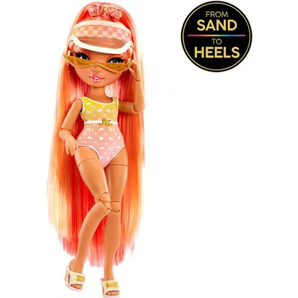 Sei du selbst mit der Pacific Coast Rainbow High Modepuppe Simone Summers. Sie hat tolle Gesichtszüge und pink-orangenes Haar; ihre Beine sind auswechselbar, sodass sie Sandalen und High Heels tragen kann (alle RH Heels passen). Simone kommt von der Westküste und ist immer auf der Suche nach dem perfekten Foto. Sie trägt einen, bedruckten Badeanzug, einen Wickelrock mit Perlen, Sandalen und eine Schirmmütze. Wichtige Pool Accessoires fehlen natürlich auch nicht.