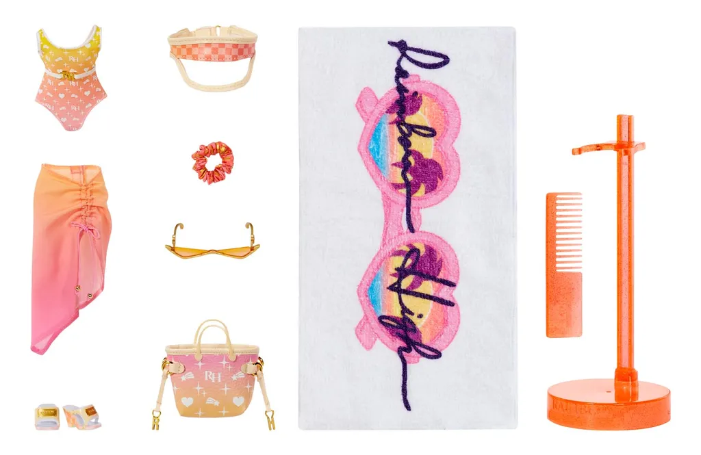 Die Rainbow High Mädels sind bereit für den Sommer. Die wunderschöne Modepuppe ist voll beweglich, der Kopf lässt sich einfach auf und ab bewegen und nimmt viele Posen ein. Die Puppe hat langes Haar zum stylen, kommt mit zwei Outfits, ein Strandoutfit und eine leichte Bedeckung, sowie coolem Strandzubehör wie ein Hut, ein Strandtuch und eine Strandtasche sowie einem coolen Wasserspielzeug. Der Puppenstände ist gleichzeitig ein Surfbrett.Achtung: Achtung. Nicht für Kinder unter 3 Jahren geeignet. Kleine Teile. Erstickungsgefahr