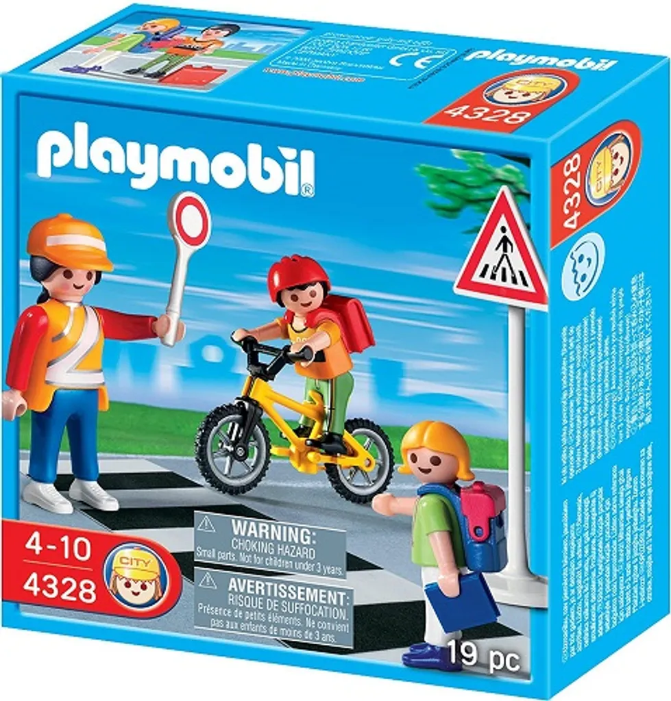 PLAYMOBIL®-Schule, 4328 Schulweghelferin mit Kindern. Gleich beginnt die Schule, und am Zebrastreifen ist mächtig was los. Die Schulweghelferin sorgt dafür, dass die Autofahrer anhalten und die Kinder sicher zu Fuß oder mit dem Fahrrad die Straße überqueren können.