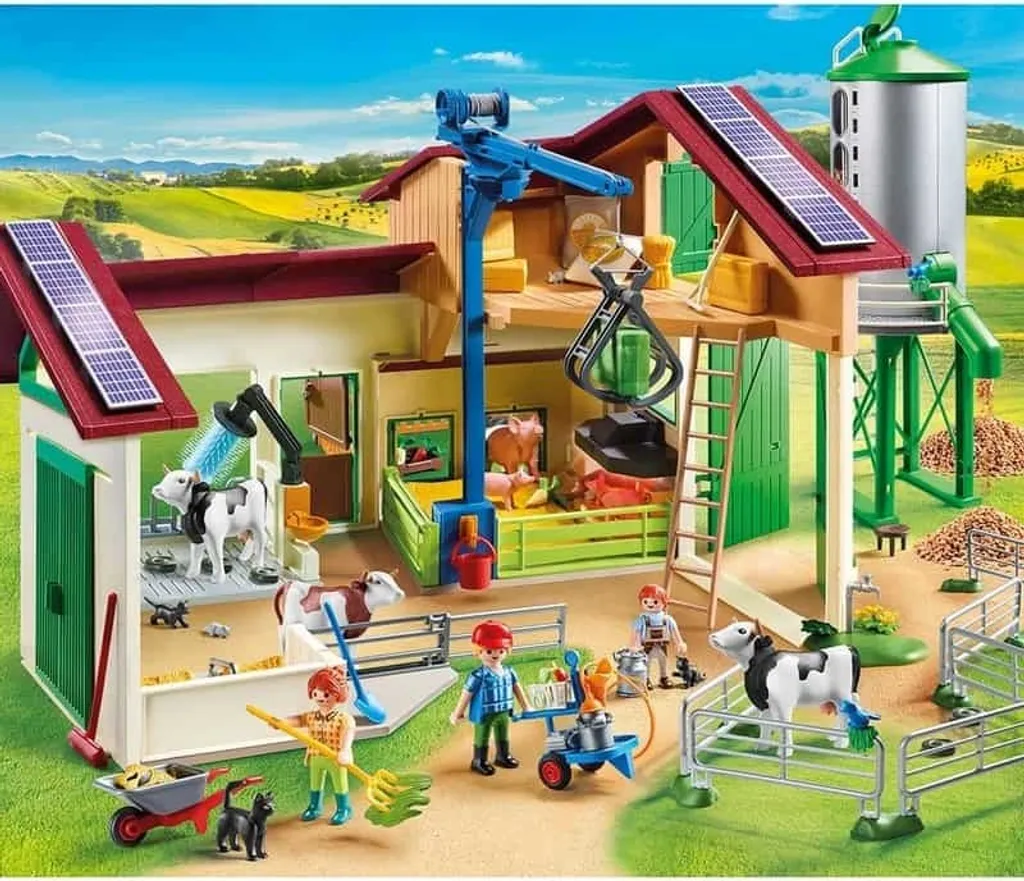 Auf dem neuen großen PLAYMOBIL®-Bauernhof mit Silo haben die Tiere jetzt noch mehr Platz. Während eine Kuh gerade am Waschplatz sauber gemacht wird, genießen die Schweine im Stall eine Sonnenbad. Der Bauer transportiert einen Heuballen mit der Seilwinde auf den Heuboden und der junge Sohn spielt mit dem kleinen Kätzchen. Als nächstes muss noch die Melkmaschine geputzt werden. Auf dem Bauernhof gibt es immer viel zu tun.Bauernhof-Spielspaß: Der moderne Bauernhof ist mit Silo, fahrbarer Melkmaschine, Lastenaufzug und vielen Tieren ausgestattet. Der Lastenaufzug ist schwenk- und verschiebbar und das Silo kann gefüllt und wieder entleert werden.