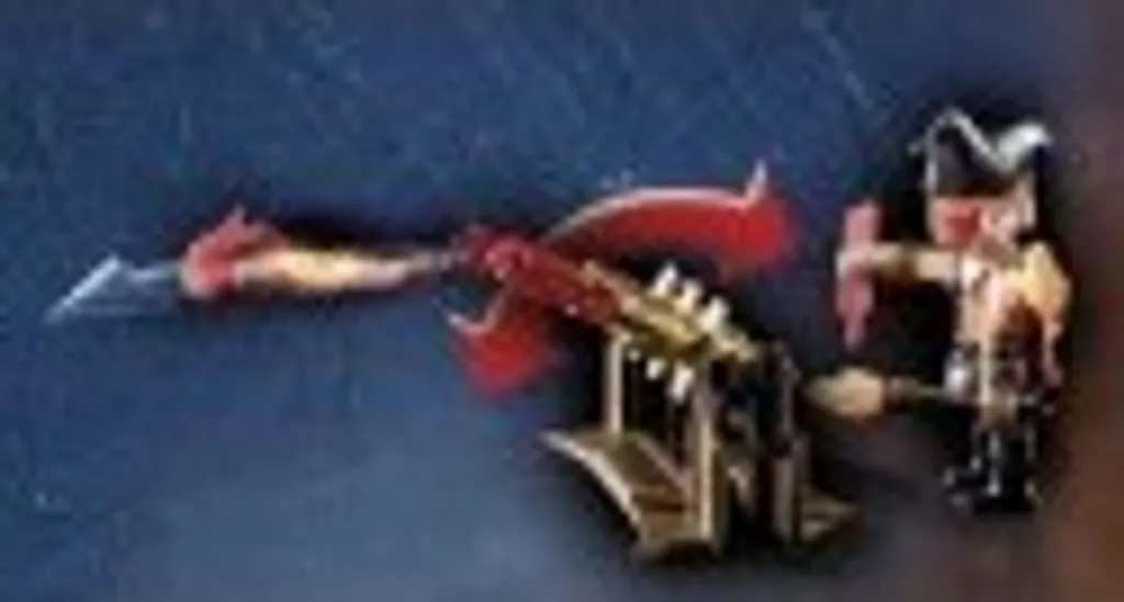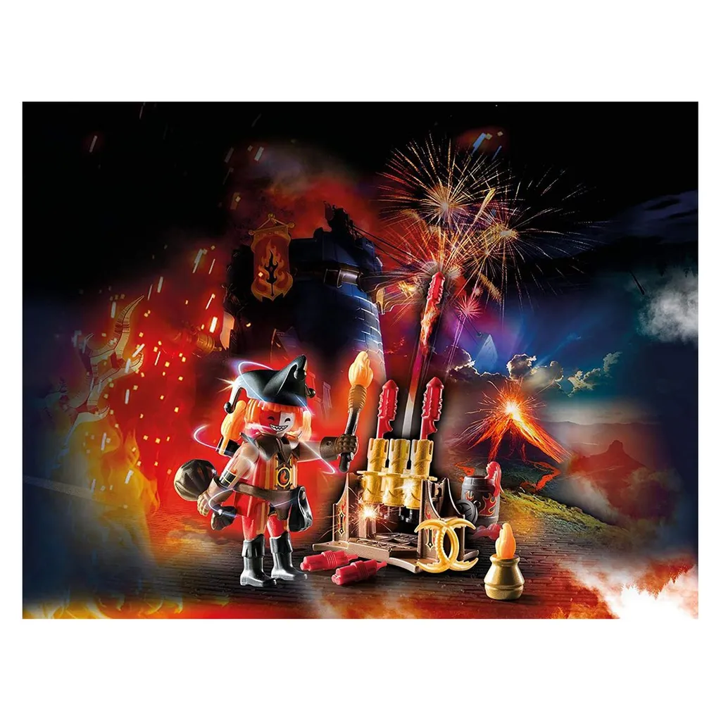 Sprengmeister mit abschießbaren Feuerwerkraketen und Feuerbällen. Figuren: 1 JokerFlammenspieler Tiere: keine Zubehör: 3 Feuerwerraketen, 2 Feuerkugelgeschosse, 1 Dynamitstange, 1 Schwarzpulversäckchen, 2 Fackeln, 1 Fass, 1 Halterung für Flammen, 1 Handschuhe, 1 Gürteltasche