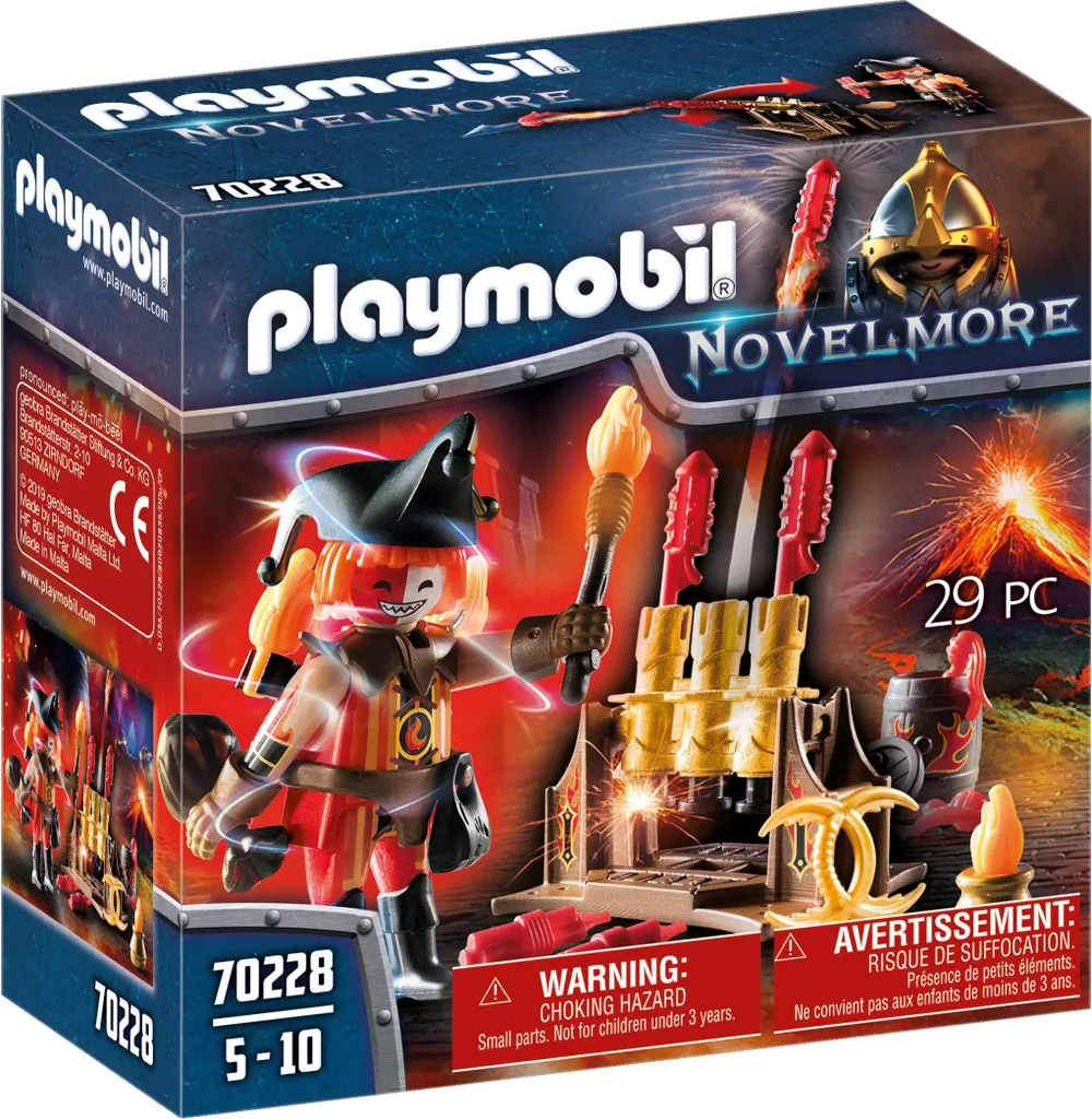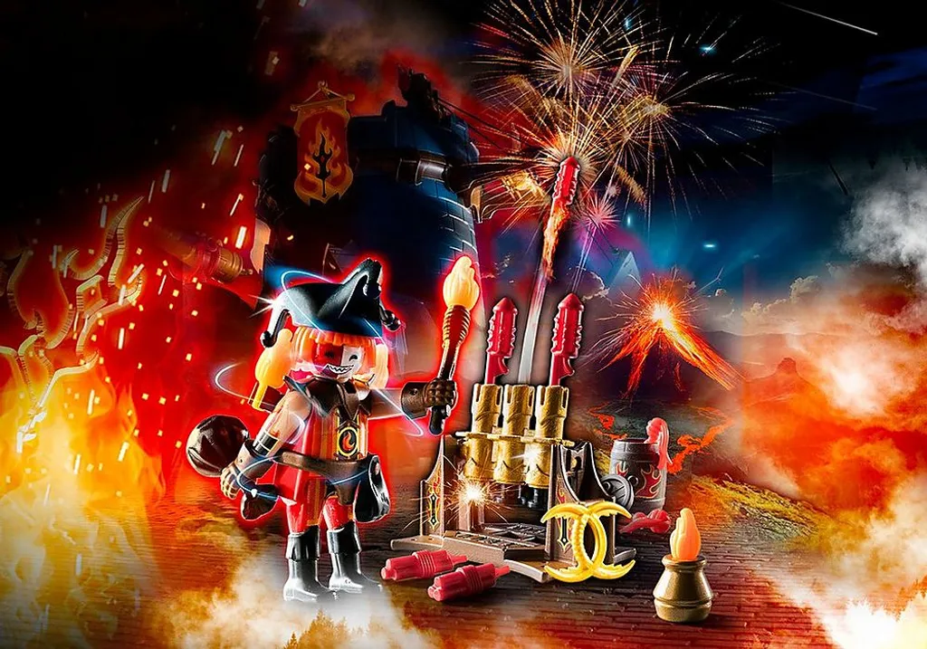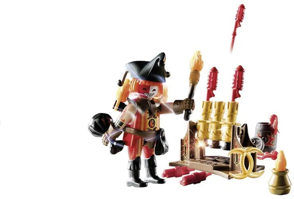 PLAYMOBIL Novelmore – Burnham Raiders Feuerwehrmann Dieses Spielset enthält den NovelmoreCharakter-Feuermeister Kahboom, einen Werfer mit Feuerraketen und Feuerkugeln und anderen tollen Extras. Die Raketen können einzeln abgefeuert werden. Im Kampf nutzen die Burnham Raider Feuerwerk als Überraschungseffekt, um ihre Gegner zu verwirren!