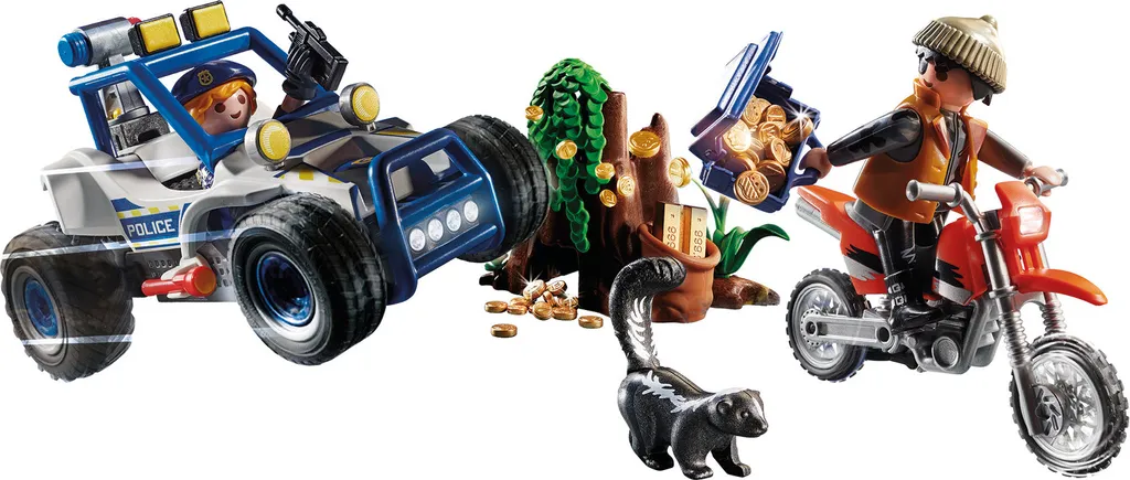 Das Spielset enthält zwei PLAYMOBIL-Figuren, ein Motocross-Bike, einen Polizeigeländewagen, einen hohlen Baum, ein Stinktier, Goldmünzen, Pistolen und viele weitere Extras.