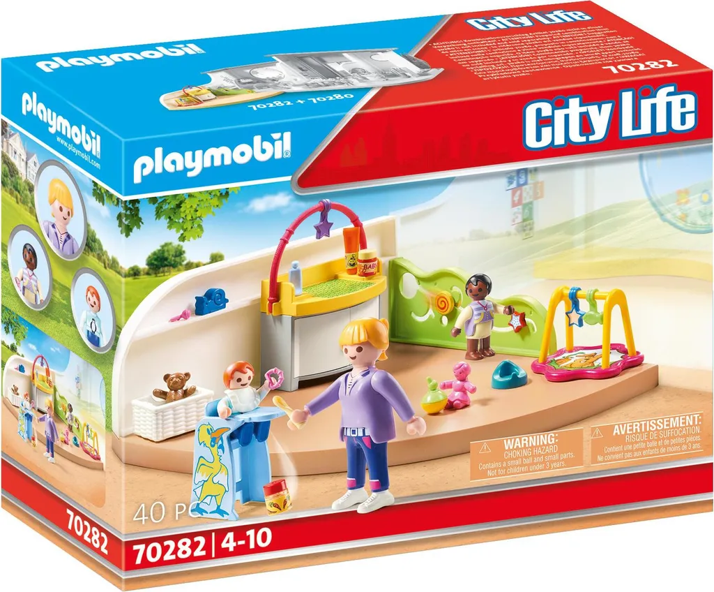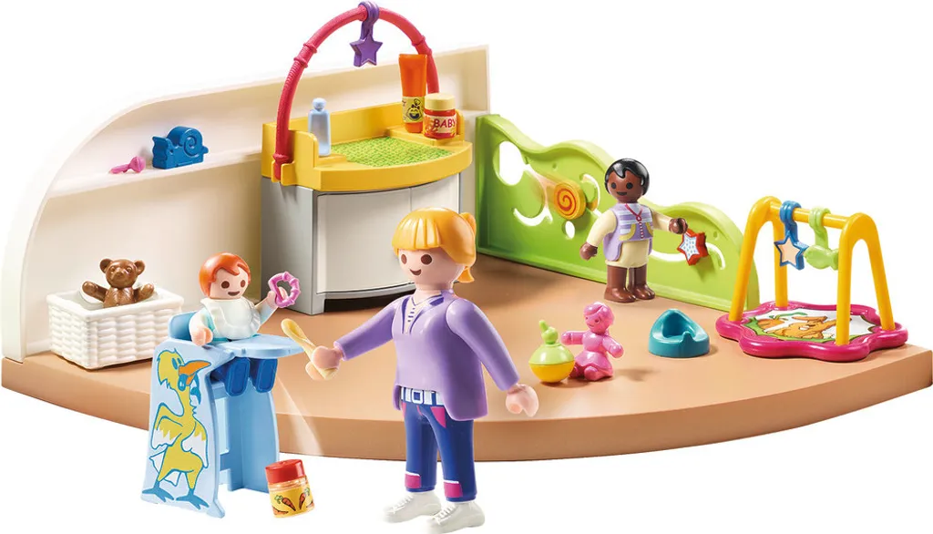 Das Spielset enthält drei PLAYMOBIL-Figuren, eine Wickelkommode, eine Krabbeldecke mit Spielebogen und Anhängern, eine Hochstuhl, sowie einer Motorikwand und vielen weiteren Extras. Die Krabbelgruppe ist ideal kombinierbar mit der KiTa Regenbogen (Art. Nr. 70280).
