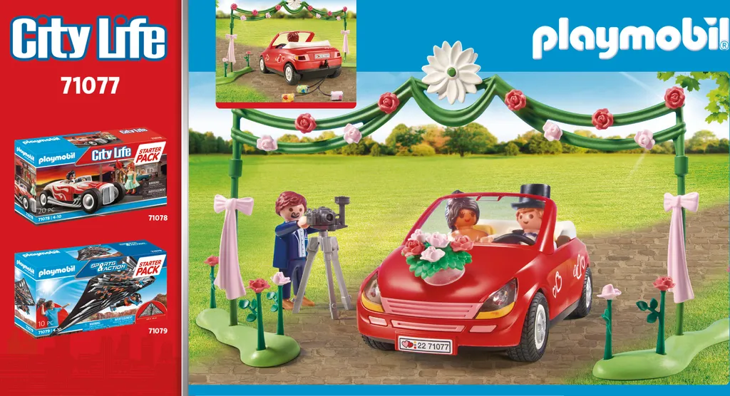 Zubehör: 1 Auto, 1 Fotoapparat, 1 Dosen, 1 Hochzeitsdeko, 1 Blumenstrauß