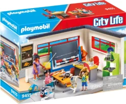 Zubehör: 1 Klassenzimmer, 1 Dachelement, 1 Regal, 1 Pult, 1 Drehstuhl, 1 Schulbank, 2 Stühle, 1 Papierkorb, 1 Tafel mit Rechenstab, 1 Zeigestab, 2 Ablagefächer, 1 Geodreieck, 1 Lineal, 1 Stift, 1 Schwamm, 1 Monitor, 1 Lupe, 2 Hängemappen, 1 Urkunde, 2 Bücher, 1 Knochen, 4 Waffenspitzen, 1 Axt, 1 Fossil, 1 Büste, 1 Krone, 1 Helm mit Schweif, 1 Ritterhelm mit Feder, 2 Rucksäcke, 1 Kleid (zweiteilig), 1 Haarblüte