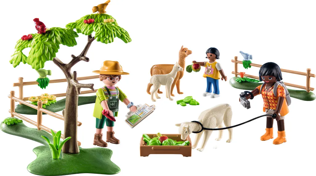 – Das 56-teilige PLAYMOBIL-Set enthält drei Spielzeugfiguren, zwei Alpakas und zwei Crias (Jungtiere), Salat, Apfel, Futter und weitere Extras für eine lustige Alpaka-Wanderung.