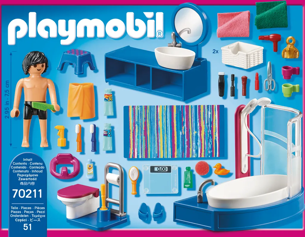 Zubehör: 1 Waschtisch mit Waschbecken und Spiegel, 1 Badewanne, 1 Toilette mit Klopapierhalter und Klobürste, 1 Kindertoilettensitz, 1 Hocker, 2 Körbe, 1 Teppich, 1 Lippenstift, 1 Wimperntusche, 1 Puderpinsel, 1 Kamm, 1 Haarbürste, 2 Tassen, 2 Tuben, 2 Zahnbürsten, 1 Sprühflasche, 1 Flakon, 1 Schere, 2 Kosmetikflaschen, 1 Fön, 1 Rasierer, 1 Personenwaage, 1 Badetuch, 1 Badeente, 2 Handtücher, 1 Schwamm, 1 Paar Badeschlappen