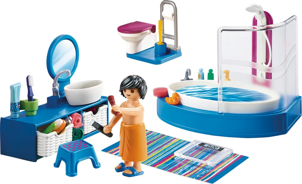 Dieses Badezimmer ist eine richtige Wohlfühloase für die ganze Familie! Die große Wanne lädt zum Duschen, Baden und Planschen ein. Mit einem Hocker kommen auch Kleinkinder zum Waschbecken und im Schrank ist viel Platz für Handtücher, Kamm, Rasierer und Föhn. Das Spielset enthält eine männliche PLAYMOBIL®-Figur, eine Bdewanne mit integrierter Dusche, einen Waschtisch mit Körben, eine Toilette mit separatem Kinderaufsatz, eine Waage und viele weitere Badezimmerutensilien. Das Badezimmer passt perfekt ins Große Puppenhaus Art.Nr. 70205. Die neue PLAYMOBIL®-Spielwelt Puppenhaus lädt mit liebevollen Details zum kreativen Rollenspiel rund um das Familienleben ein.