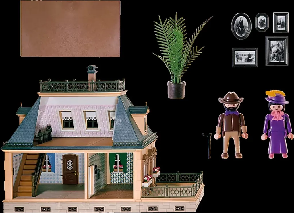 Figuren: 1 Frau, 1 Mann, Zubehör: 1 Puppenhaus mit Terrasse, 1 Hut mit Feder, 1 Hut, ein Spazierstock, 1 Pflanze mit Topf, 8 Blumenkästen mit Blumen,