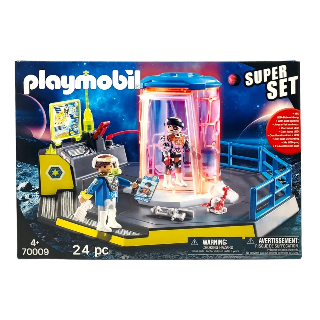 PLAYMOBIL Space – SuperSet Weltraumpolizei Auch im Weltraum hat das Böse keine Chance, denn hier sorgt die Weltraumpolizei für Gerechtigkeit und Ordnung. In ihrem Kontrollzentrum bewachen sie den Bereich mit dem Bildschirm und warten auf die nächste Mission. Die Gefängniszelle ist durch LED-Leuchten geschützt. Das LED-Lichtmodul (ohne Batterien) leuchtet bei geschlossener Tür.