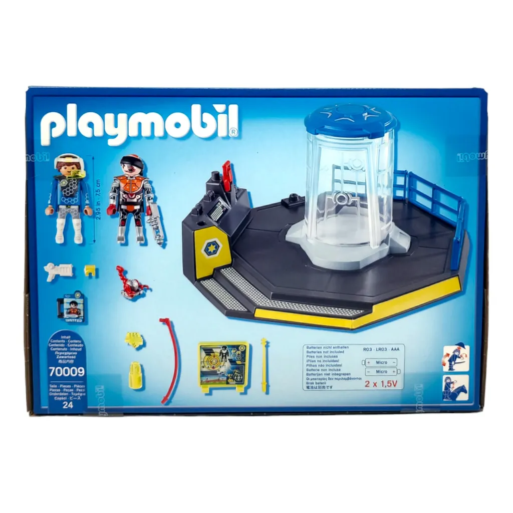 Spezifikationen: Serie: Raum Seriennummer: 70009 Geschlecht: Juniorin Alter: 4 – 10 Jahre alt Batterien: 2 x 1,5 V AAA (nicht im Lieferumfang enthalten) Farbe: blau Material: Kunststoff Abmessungen: 22 x 21,5 x 12,5 cm (LxBxH) Inhalt: 2 PLAYMOBILFiguren 1 Gefängniszelle 1 Kontrollzentrum 9 Zubehör