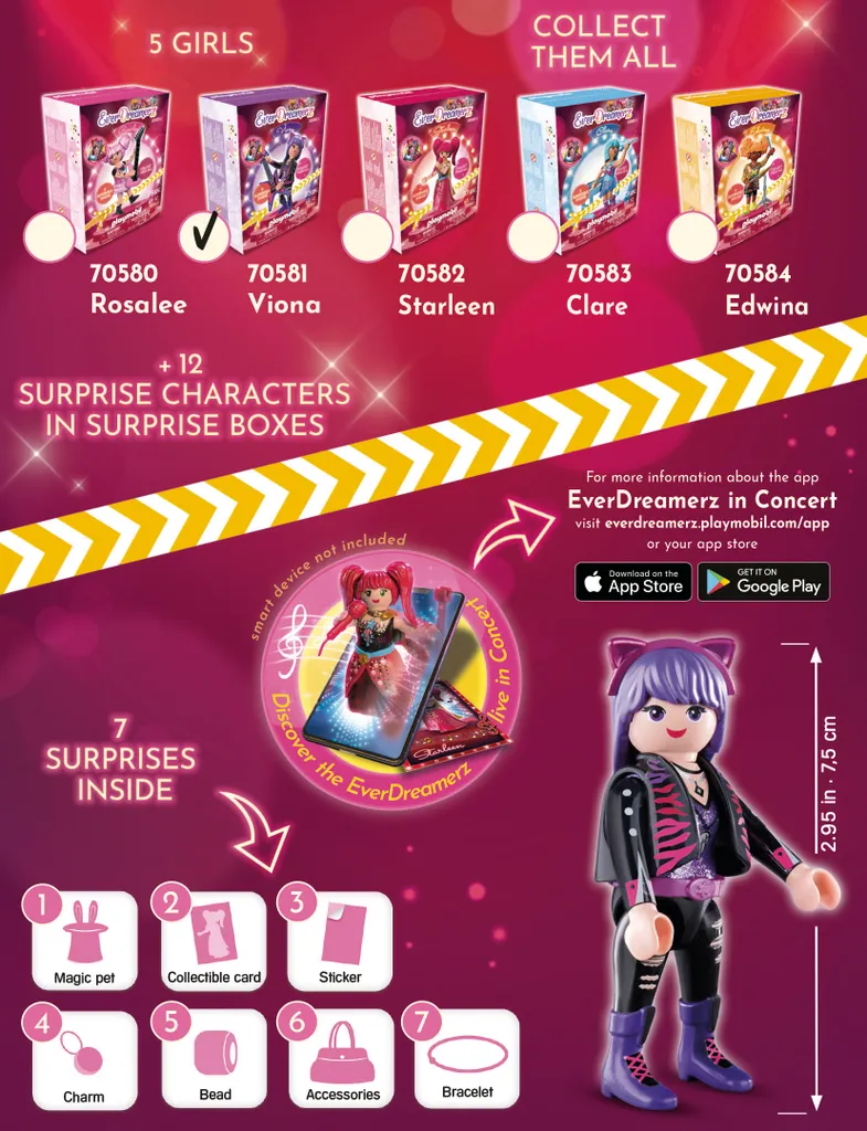Viona ist die geheimnisvolle Tagträumerin der Mädchengruppe. Sie hält sich gern im Hintergrund und drückt ihre Gefühle durch Gedichte und Bilder aus, wobei ihre Lieblingsfarbe Lila ist. Sie sorgt für die nötige Inspiration und, mit ihrem Bass, für den musikalischen Tiefgang der Gruppe. Inkl. Silikonarmband, Schmuckperlen und Bassgitarren-Charm, Sammelkarte, Sticker und viel Zubehör. Mit der zugehörigen App und AR-Feature kommst du der Music World der EverDreamerz noch ein Stückchen näher und kannst die 5 Freundinnen live auf der Bühne erleben.