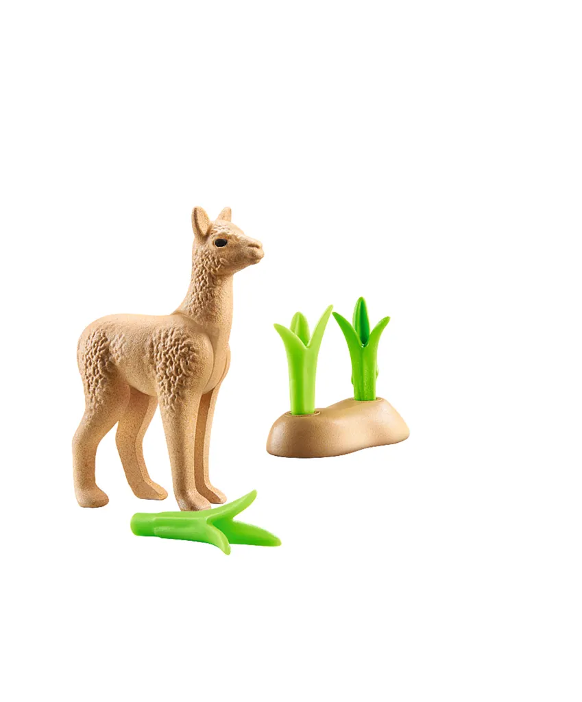 Alpakas gehören, so wie Lamas, zur Familie der Kamele und sind in Südamerika heimisch. Am wohlsten fühlen sich die Tiere mit dem kuschelig-weichen Fell in der Gruppe. Ihre Herde ist für die Tiere sehr wichtig. Ausgewachsene Alpaka Stuten, bringen etwa 55 – 65 Kilogramm auf die Waage, also in etwa so viel wie zwei achtjährige Kinder. Die männlichen Tiere, Hengste genannt, wiegen etwas mehr. Die Wiltopia-Spielwelt von PLAYMOBIL lädt Kinder dazu ein, spannende und schützenswerte Regionen unserer Welt und ihre zahlreichen tierischen Bewohner zu entdecken und verbindet Spielen und Lernen auf einzigartige Weise. Im PLAYMOBIL-Set enthalten ist ein junges Alpaka, eine Graspflanze, Gras und eine Tierwissenskarte. Das Alpakajunge kann seinen Kopf nach oben und unten neigen.