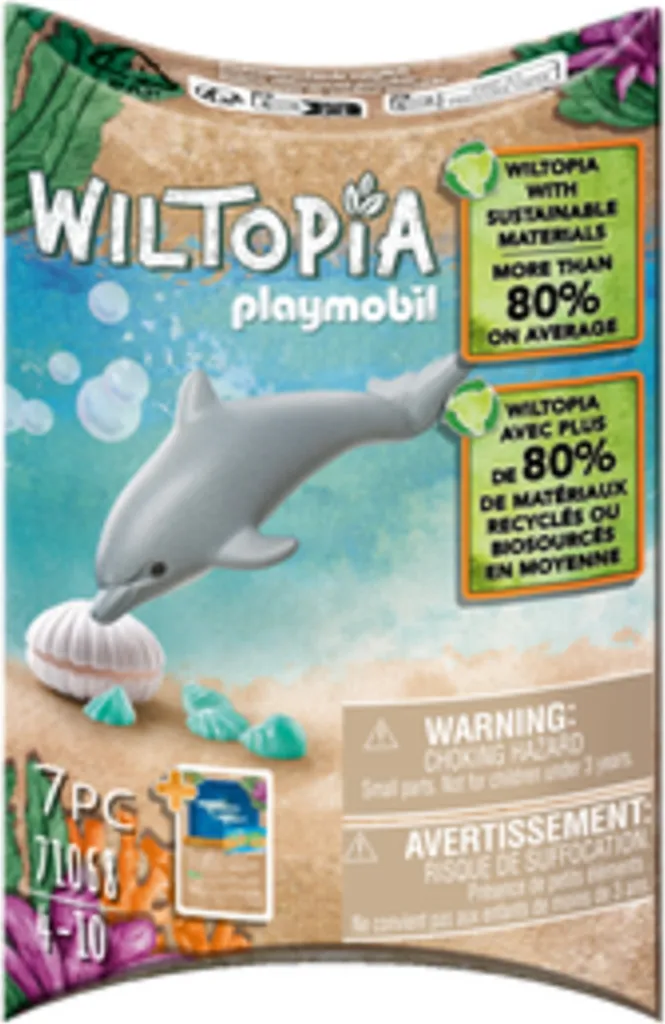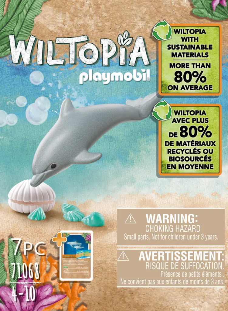 Delfine sind in allen Weltmeeren zu Hause. Die verspielten Meerestiere sind sehr neugierig und helfen sich gegenseitig. Delfine haben einen sehr guten Gehörsinn und verständigen sich mit einer Art Gesang. Außerdem verwenden sie Klicklaute, um Futter, Boote und sogar Taucher, mit denen sie spielen können, ausfindig zu machen. Die Wiltopia-Spielwelt von PLAYMOBIL lädt Kinder dazu ein, spannende und schützenswerte Regionen unserer Welt und ihre zahlreichen tierischen Bewohner zu entdecken und verbindet Spielen und Lernen auf einzigartige Weise. Im Spielset enthalten ist ein junger Delfin, eine Riesenmuschel, vier kleine Muscheln und eine Tierwissenskarte. Das Delfinjunge ist schwimmfähig und kann aufrecht auf der beweglichen Flosse stehen.
