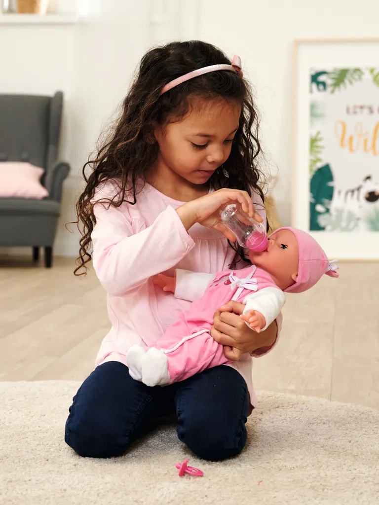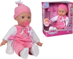 „ML Laura Babysprache: Die süße kleine Weichkörperpuppe Laura „“Babysprache““ sagt ihre ersten Worte. Sie hat Schlafaugen, trägt einen süßen Strampler mit Mütze und kann 24 Babylaute wie „“Mama““, „“Dada““, „“Hihi““ und viele mehr von sich geben. Im Set ist die 38cm große Laura, ein Schnuller und eine Flasche enthalten. Für Kinder ab 2 Jahren geeignet. Batterien 3x 1,5V LR44 sind enthalten.“