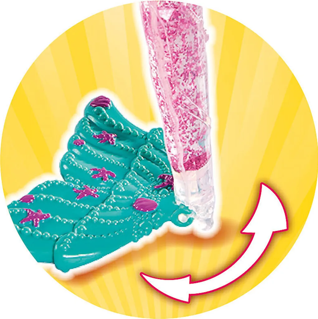 Steffi erkundet als wunderschöne Meerjungfrau die Unterwasserwelt. Schüttelt man ihre durchsichtige Schwanzflosse beginnt diese toll zu glitzern und bei Druck auf den Seestern an ihrer Kette fängt die Flosse an bunt zu leuchten. Klappt man das Ende der Schwanzflosse um, kann Steffi sogar aufrecht stehen.