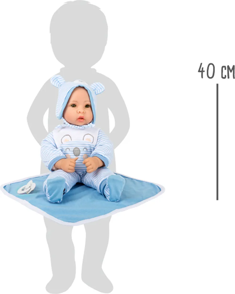 Puppe Lukas ist einfach zum Knuddeln! Mit seinen strahlenden Augen und den aufgeklebten Wimpern verzaubert er alle Puppeneltern auf Anhieb. Die niedlich gestreifte Babybekleidung lässt sich ganz leicht an- und ausziehen. Eine farblich abgestimmte Mütze mit Öhrchen, ein Schnuller und die weiche Decke machen das Outfit perfekt – vor allem, wenn es mit den Puppeneltern auf einen Ausflug geht!