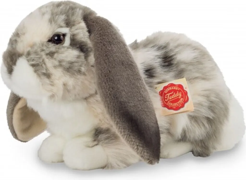 Widderkaninchen sitzend grau-weiß 30 cm aus der Teddy Hermann® Collection aus hochwertigem Plüsch gefertigt und mit weicher Polyesterwatte gefüllt. 30 Grad waschbar, Schonwäsche. Nicht in den Trockner.