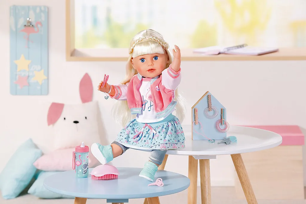 Diese exklusive BABY BORN Puppe Sister“ begeistert mit den sechs lebensechten Funktionen für ein authentisches Spielvergnügen sowie ihrem stylischen Outfit. Sie trägt eine glänzende Leggings, einen Rock mit Flamingomotiven, coole Sneakers sowie eine sportive Plüschjacke. Besonders hübsch sind ihre langen Haare, die Puppeneltern ganz nach Wunsch frisieren können. Wie wäre es mit einem hohen Pferdeschwanz oder lustig geflochtenen Zöpfen? Der Fantasie sind keine Grenzen gesetzt!Details:- exklusiv nur bei myToys!- BABY born® Puppe „Sister“- 6 lebensechte Funktionen- mit frisierbaren Haaren- kann Tränen weinen- badefähig- fördert die Fantasie- braucht keine BatterienLieferumfang:- BABY born® Sister Puppe- 1 x T-Shirt- 1 x Leggings- 1 x Jacke- 1 x Paar Sneaker- 1 x Flasche- 1 x Haarbürste- je 1 x Freundschaftsbändchen für Kind und Puppe- weiteres Zubehör zum FrisierenMaße: ca. 43 cm (Länge)“